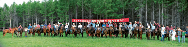 2010年6月5日一大早,參與此次由《馬術(shù)》雜志聯(lián)合內(nèi)蒙古牙克石政府、內(nèi)蒙古馬業(yè)協(xié)會、內(nèi)蒙古牙克石三河馬保種繁育基地、北京黑美人馬術(shù)推廣有限公司、北京西塢鄉(xiāng)村國際馬術(shù)俱樂部以及內(nèi)蒙古牙克石鳳凰旅游有限責(zé)任公司共同發(fā)起的“走上高高的興安嶺暨2010內(nèi)蒙古牙克石騎馬日”活動的部分馬友匯合北京南苑機(jī)場,準(zhǔn)備一同前往內(nèi)蒙古呼倫貝爾市的牙克石。 6月25日(第一天): 【8:30】 北京南郊的南苑機(jī)場,一群身著牛仔裝束,頭戴牛仔帽的馬友們相聚在這里,在這個本來就不大的機(jī)場其樂融融著。因?yàn)檐娪脵C(jī)場的緣故,我們留下的照片不多,但寥寥幾張也能體現(xiàn)出大家的興奮與快樂。 【11:30】 中午時分我們抵達(dá)呼倫貝爾機(jī)場,經(jīng)過一個多小時的車程抵達(dá)駐扎地內(nèi)蒙古牙克石鳳凰山莊。 【18:30】 簡單午餐,小憩片刻,我們得到了當(dāng)?shù)厥形瘯浀挠H自接見,并共進(jìn)了晚餐,也體現(xiàn)出了當(dāng)?shù)貙τ谖覀兇舜悟T馬穿越活動的重視。 【20:00】 飯后返程的路上,牙克石的夕陽與我們結(jié)伴同行。近的似乎觸手可得,與余輝照耀下的美景交相呼應(yīng)著,也點(diǎn)綴著我們這次即將開始的騎行之旅。 【20:30】 晚上的準(zhǔn)備會,我們了解了這次行程的具體路線安排。因?yàn)槲覀円┰降氖亲钭匀坏拇蟛菰?,最自然的原始叢林,所以對于此次活動中的安全問題,主辦方也是再三強(qiáng)調(diào)并做了精心的安排。當(dāng)?shù)仡I(lǐng)導(dǎo)親自給我們講述了路途中的注意事項(xiàng),并專門派出了馬工陪伴我們前行,為了保證大家的安全,領(lǐng)頭的馬工還佩戴了槍支,而《馬術(shù)》雜志也在出發(fā)前就給大家準(zhǔn)備了意外保險,體現(xiàn)了這次活動對于馬友的體貼。 6月26日(第二天): 【5:30】 6月26日清晨5點(diǎn)的牙克石,層層山巒上的薄霧早已散去,太陽早早升起,映照著郁郁蔥蔥的鳳凰山莊,路旁的小鹿們似乎不怕這些遠(yuǎn)道來的陌生人,跟在“家長”后面,愜意地享受著自己的步伐。而來自全國各地的近五十名馬友正在緊張忙碌地穿戴整齊,備好馬鞍。清馨的空氣不免讓人心曠神怡,坐著車,望著窗外秀麗景色,我們?nèi)ハ鄷切┚鸵惆榇蠹叶冗^兩天愉快之旅的馬兒們。 【6:30】 距離駐地不遠(yuǎn)的馬廄里,50多匹三河馬早已等候在此,這些馬匹都是李勇剛和暉子耐心篩選,精心調(diào)教出來的。盡管野性尚存,但對于我們這些早已與馬心心相通的“馬瘋子”們來說,與它們交流不是難事。 【7:00】 七點(diǎn)整,開幕式在中央電視臺著名主持人蔡猛的主持下簡單精彩,隨著領(lǐng)導(dǎo)的一聲令下,穿越活動正式開始。 【7:15】 整個騎馬穿越的隊(duì)伍,第一天要走近60公里的路程。他們要跨過草原,翻越山嶺,穿越原始叢林。牙克石是大興安嶺首府,處于呼倫貝爾草原和中國最大的原始深林交接地帶,穿越這片原生態(tài)“凈土”,走在高高的興安嶺,放飛那顆久居城市中被“禁錮”的心。 【7:25】 馬隊(duì)在往山頂?shù)牡缆飞硝獠街?,沒有人放開韁繩讓馬肆意地撒歡,大家井然有序地跟著領(lǐng)路的頭馬排成一排前進(jìn)著。既為了保持體力,也是為了保護(hù)部分騎術(shù)不算精湛的馬友們的安全,更像在體會這種藍(lán)天白云,綠草小馬的感受。 【8:25】 我們和為保護(hù)整個穿越活動安全的當(dāng)?shù)毓惨黄?,注視著馬隊(duì)的到來。從這里開始,他們會爬上一座小山,沿著山路的等高線騎行。 【8:50】 馬隊(duì)在第一個休息點(diǎn)休息完畢,重新出發(fā)。雖然午后炙熱的陽光照在頭上,紛飛的蟲子們縈繞四周,但是大家依然熱情不減,終點(diǎn)不是目的,享受過程才是這次騎行最重要的。 【11:40】 沿著山路的等高線騎行不多久,馬隊(duì)進(jìn)入了原始叢林。神秘的叢林中似乎充滿著無限魅力,令人向往,當(dāng)然也是組織者最為擔(dān)心的一段行程。整個馬隊(duì)依然整齊的排成一字型,隔著一定的距離前進(jìn)著。出發(fā)前,組織者就告訴大家要在十點(diǎn)之前進(jìn)入?yún)擦郑驗(yàn)檫@里的清爽可以不至于讓馬友和馬匹損失過多的體力,同時碩大的蚊子也會相對的沒有那么活潑。 【16:00】 由于汽車無法開進(jìn)原始叢林,所以我們提前到達(dá)馬隊(duì)第一天休息的營地,等待著馬隊(duì)勝利歸來。一排排整齊的帳篷就將是各位馬友今晚休息的地方。在不遠(yuǎn)處的空地上,將是大家騎乘的馬匹休息的地方,為了讓大家切身地感受草原生活,體會不同的與馬為伴的生活,整隊(duì)的馬友們會分成兩人一組來值班照看馬匹。營地的周圍有熊出沒的可能,所以大家還會在馬圈的周圍攏上煙,防止熊傷害馬匹。 【16:42】 第一方隊(duì)的馬友們繞過山路,出現(xiàn)在了我們眼前。十個人快馬加鞭,讓馬兒奔跑的速度加快,也是用這樣的方式在享受著他們的自由自在。 【18:30】 第一天的晚宴正式開始,大家觥籌交錯,放聲歌唱,點(diǎn)燃篝火,一同起舞,享受著縱馬馳騁之后的愜意。 走上高高的興安嶺暨2010內(nèi)蒙古牙克石騎馬日 6月27日(第三天): 【8:30】 最后一天,為了保證各位馬友不會因?yàn)樘柕闹睍褚约扒耙惶斓钠趯?dǎo)致意外的發(fā)生,我們的行程是從穿越原始叢林開始的。 【9:50】 成功穿越原始