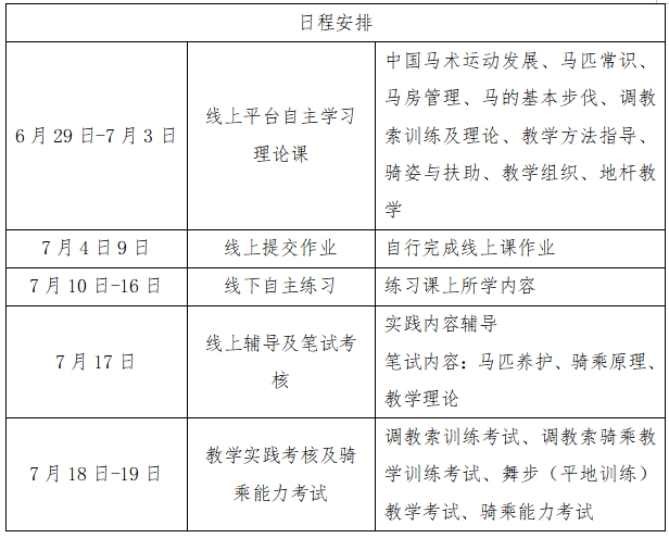 中國(guó)馬術(shù)協(xié)會(huì)關(guān)于在線上舉辦一星級(jí)專業(yè)教練培訓(xùn)考核的通知 各相關(guān)單位、會(huì)員、馬術(shù)愛好者: 馬術(shù)一星級(jí)專業(yè)教練培訓(xùn)考核將于2023年6月29日-7月19日在線上開班。本次活動(dòng)以線上方式進(jìn)行培訓(xùn)與考核,中外專家聯(lián)合授課??己撕细裾邔⒈皇谟柚袊?guó)馬術(shù)一星級(jí)專業(yè)教練員能力水平證書,并可進(jìn)一步申報(bào)全國(guó)初級(jí)教練員崗位班,經(jīng)考試合格后獲取初級(jí)職稱。 中國(guó)馬術(shù)星級(jí)教練體系引入國(guó)際權(quán)威騎術(shù)及教學(xué)所需知識(shí)技能,由國(guó)際國(guó)內(nèi)專家聯(lián)合授課。培訓(xùn)借助現(xiàn)代化技術(shù)豐富教學(xué)方式,提供跟蹤輔導(dǎo),提升教練員職業(yè)素養(yǎng)和技能。 現(xiàn)就本次培訓(xùn)考核相關(guān)事宜通知如下: 一、培訓(xùn)考核時(shí)間、地點(diǎn) (一)線上培訓(xùn):2023年6月29日-7月3日,學(xué)員通過網(wǎng)絡(luò)授課形式,自主登陸參加集中時(shí)段的線上學(xué)習(xí)。 (二)線下練習(xí):2023年7月4日-16日,學(xué)員自主線下練習(xí)并提交作業(yè)。 (三)線上輔導(dǎo)和實(shí)踐考核:2023年7月17日-19日,在線上集中輔導(dǎo)與實(shí)踐考核。 二、培訓(xùn)考核內(nèi)容 ※具體日程安排詳見后續(xù)日程安排表,根據(jù)報(bào)名人數(shù)可能會(huì)有調(diào)整。 三、報(bào)名資格要求 (一)年滿18周歲,身體健康; (二)中馬協(xié)中三級(jí)及以上級(jí)別或具備中三級(jí)騎手相應(yīng)能力,培訓(xùn)考核中包含中三級(jí)騎乘能力測(cè)試; (三)有一年以上的馬術(shù)項(xiàng)目教學(xué)經(jīng)歷; 四、報(bào)名事項(xiàng) (一)報(bào)名時(shí)間:自即日起至2023年6月26日12:00前報(bào)名并提交審核材料于報(bào)名專用郵箱,名額數(shù)量有限,報(bào)名從速,逾期報(bào)名無效。 (二)報(bào)名資料:報(bào)名表電子版,一寸白底照片電子版,身份證復(fù)印件,馬術(shù)項(xiàng)目騎手等級(jí)證書復(fù)印件。 (三)報(bào)名方式:將報(bào)名表、一寸白底照片電子版、身份證電子版、騎手證電子版等報(bào)名資料打包發(fā)送至報(bào)名郵箱。 報(bào)名郵箱:liu.ying@ceatpo.com (四)報(bào)名確認(rèn):學(xué)員報(bào)名即需提交審核材料,確認(rèn)后請(qǐng)于截止日期前繳納報(bào)名費(fèi),最終以報(bào)名確認(rèn)信息或報(bào)名確認(rèn)郵件為準(zhǔn)。 (五)退課:課程準(zhǔn)備工作按報(bào)名人數(shù)進(jìn)行,因此報(bào)名一旦確認(rèn)即產(chǎn)生費(fèi)用。開課前15天及以上,可退款50%;開課前7天以上,不足15天,可退款25%;開課前7天內(nèi)(包含7天),不予退款。 (六)報(bào)名、咨詢聯(lián)系人:劉穎 聯(lián)系電話:18612650507 微信號(hào):liu18612650507 郵箱:liu.ying@ceatpo.com (七)收費(fèi)標(biāo)準(zhǔn):7500元 (八)付款方式:銀行轉(zhuǎn)賬 匯款銀行:北京銀行天壇支行 匯款賬戶名:北京中聯(lián)金馬體育發(fā)展有限公司 賬號(hào):20000045341600037064420 ※備注:1.【一星級(jí)教練員- 姓名 - 所繳費(fèi)用】 2.匯款截圖或退款通知單請(qǐng)拍照截圖發(fā)送至報(bào)名郵箱:liu.ying@ceatpo.com (九)如遇不可抗力因素(政府行為、戰(zhàn)爭(zhēng)、自然災(zāi)害、疫情問題等)造成學(xué)員的損失,中國(guó)馬術(shù)協(xié)會(huì)根據(jù)不同情況酌情處理。 附件:培訓(xùn)報(bào)名表 中國(guó)馬術(shù)協(xié)會(huì) 2023年6月13日 掃碼可獲取附件 |