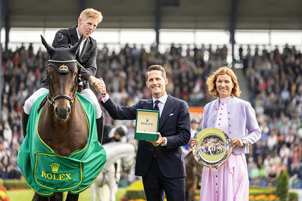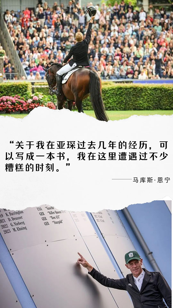 德國騎手馬庫斯·恩寧(Marcus Ehning)搭檔“Stargold”獲得2023年亞琛世界馬術(shù)節(jié)勞力士大獎賽冠軍 ?Rolex/Lindsay Brock 對于2023年亞琛世界馬術(shù)節(jié)來說,這場精彩的勞力士大獎賽是勞力士場地障礙賽大滿貫創(chuàng)辦十周年的特別紀(jì)念。三名德國騎手登上領(lǐng)獎臺,冠軍人馬組合是馬庫斯·恩寧(Marcus Ehning)和“Stargold”。 回首過去十年,上一次在亞琛奪得勞力士大獎賽的勝利是在2018年,他搭檔“Pret A Tout”出戰(zhàn)。 獲得2023年亞琛世界馬術(shù)節(jié)勞力士大獎賽亞軍的是勞力士代言人、德國騎手丹尼爾·杜瑟(Daniel Deusser)。丹尼爾·杜瑟說:“這是一種復(fù)雜的感受——我本想在亞琛再贏一次(勞力士大獎賽),但另一方面,如果我們少走一步,快上半秒,隨后出場的馬庫斯就會也這么做,所以我對第二名的成績感到非常滿意?!?/div> 勞力士代言人、德國騎手丹尼爾·杜瑟(Daniel Deusser)搭檔“Killer Queen”獲得2023年亞琛世界馬術(shù)節(jié)勞力士大獎賽亞軍 ?Rolex/Ashley Neuhof 中國馬術(shù)愛好者們共同見證了馬庫斯·恩寧的奪冠時(shí)刻?!恶R術(shù)》雜志、馬術(shù)在線邀請北京奧運(yùn)會騎手張濱、全運(yùn)會冠軍騎手欒樹全程解說2023年亞琛世界馬術(shù)節(jié)勞力士大獎賽,中國中央電視臺體育解說員蔡猛擔(dān)任主持人。這場大賽由馬術(shù)雜志、馬術(shù)在線獨(dú)家引進(jìn)直播版權(quán)。 演播室現(xiàn)場 40對人馬組合共有5對進(jìn)入附加賽,其中3對來自德國——菲利普·魏斯豪普特(Philipp Weishaupt)與“Zineday”、丹尼爾·杜瑟與“Killer Queen”以及馬庫斯·恩寧與“Stargold”。 另外兩對人馬組合是墨西哥騎手尤金尼奧·加爾薩·佩雷斯 (Eugenio Garza Perez)與“Contago”以及勞力士代言人、奧運(yùn)金牌得主、巴西騎手羅德里格·佩索阿(Rodrigo Pessoa)與“Major Tom”。他們是最先進(jìn)入附加賽的兩對人馬組合,但都有四罰分的失誤。 背負(fù)眾望的美國騎手麥克萊恩·沃德(McLain Ward)策騎“HH Azur”在首輪比賽中退賽,他的勞力士場地障礙賽大滿貫之路遺憾暫時(shí)止步于此。 附加賽中緊接著出場的是菲利普·魏斯豪普特與“Zineday”,他們的行進(jìn)速度很快——43.36秒完賽,但也有一道障礙失誤。丹尼爾·杜瑟搭檔“Killer Queen”出場,他們以45.73秒的完賽時(shí)間結(jié)束比賽,成為暫時(shí)的領(lǐng)先者。 菲利普·魏斯豪普特(Philipp Weishaupt)搭檔“Zineday”獲得2023年亞琛世界馬術(shù)節(jié)勞力士大獎賽季軍 馬庫斯·恩寧和“Stargold”進(jìn)入了賽場,索爾斯體育場主場館一片寂靜。同一時(shí)間,遠(yuǎn)在亞琛現(xiàn)場的《馬術(shù)》雜志、馬術(shù)在線團(tuán)隊(duì)發(fā)回消息:緊張!現(xiàn)場見證兩大偶像針尖對麥芒的競爭!北京演播室的氛圍一改之前的輕松,欒樹深吸一口氣:“最緊張的時(shí)刻來臨了?!?/div> 亞琛看臺最前面幾排的觀眾甚至可以聽到“Stargold”有節(jié)奏的鼻息聲?!癝targold”清楚地知道自己要干什么,他的速度很快,馬庫斯·恩寧也不愿意浪費(fèi)一毫秒的時(shí)間,所有的輔助都是彈無虛發(fā)的。第5道安聯(lián)障礙和暗金色的12b,“Stargold”的起跳點(diǎn)有些近,前蹄剮蹭障礙桿,所有觀眾都倒吸一口涼氣,但好在障礙桿依舊停留在托杯上。然后,他們越過最后一道障礙,馬庫斯·恩寧看了一眼時(shí)間:45.12秒,第一名! 馬庫斯·恩寧摘下了自己的頭盔,歡呼起來,然后抱住了“Stargold”的脖子,顯然任何一種慶祝方式都難以表達(dá)這種純粹的快樂。 馬庫斯·恩寧動情時(shí)刻 頒獎典禮上,馬庫斯·恩寧忍不住地流下了眼淚,而“Stargold”則輕松地站在勞力士場地障礙賽大滿貫獎杯前,伸長了脖子,充滿自信地環(huán)顧四周,似乎意識到自己是場上的王者。 頒獎儀式合影 對于丹尼爾·杜瑟來說,十分之六秒的時(shí)間成本很高,錯失了冠軍。 菲利普·魏斯豪普特沒想到能和9歲的“Zineday”一起躋身前三名。在賽后的記者發(fā)布會上,菲利普·魏斯豪普特自豪地說:“沒有人策騎這么年輕的馬。所以,此時(shí)能夠坐在搭檔兩匹經(jīng)驗(yàn)豐富的冠軍馬的騎手旁,這是一個令我非常滿意的結(jié)果?!?/div> 本次直播是亞琛世界馬術(shù)節(jié)與《馬術(shù)》雜志、馬術(shù)在線首度的版權(quán)合作。于2023年7月2日共同推出勞力士大獎賽的中國大陸地區(qū)網(wǎng)絡(luò)直播。值得一提的是,《馬術(shù)》雜志、馬術(shù)在線擁有中國獨(dú)家直播版權(quán)。 所有這一切都發(fā)生在今年的亞琛世界馬術(shù)節(jié)上,發(fā)生在勞力士場地障礙賽大滿貫創(chuàng)辦十周年之際。亞琛世界馬術(shù)節(jié)體育主管比吉特·羅森博格(Birgit Rosenberg) 表示:“世界上頂級的賽事、悠久傳統(tǒng)、最棒的觀眾、最好的組織者,這些要素都聚集在亞琛?!?/div> 《馬術(shù)》雜志創(chuàng)始人、主編李艷陽提到本次直播時(shí)表示:“亞琛世界馬術(shù)節(jié)勞力士大獎賽夢幻般的賽事氛圍,包含著賽事組織者對馬術(shù)運(yùn)動內(nèi)在精神的理解。引進(jìn)亞琛世界馬術(shù)節(jié)勞力士大獎賽一直是《馬術(shù)》雜志、馬術(shù)在線團(tuán)隊(duì)的心愿?!?/div> 在北京市馬術(shù)運(yùn)動協(xié)會、深圳市馬術(shù)協(xié)會、中國馬文化博物館、上海市馬術(shù)運(yùn)動管理中心、天星調(diào)良馬術(shù)、西