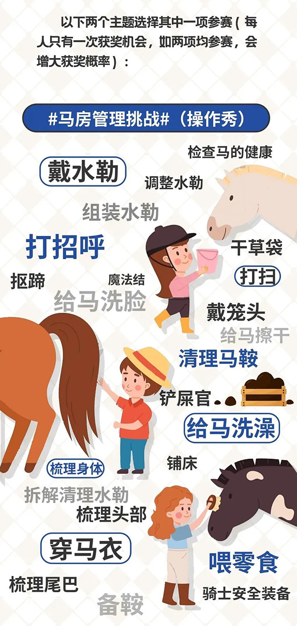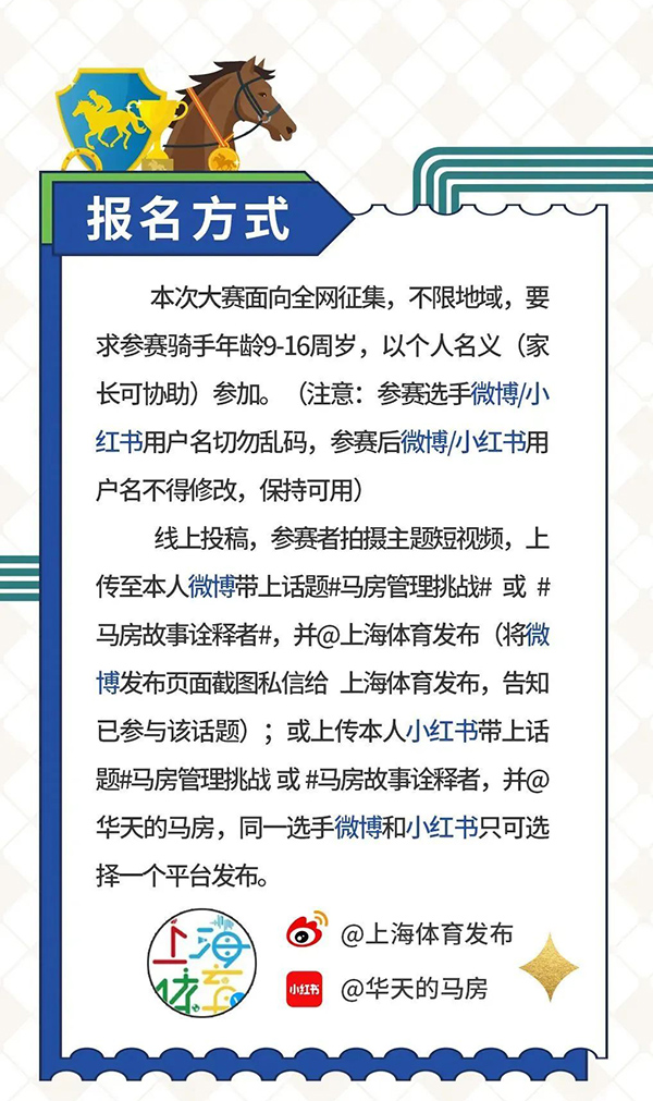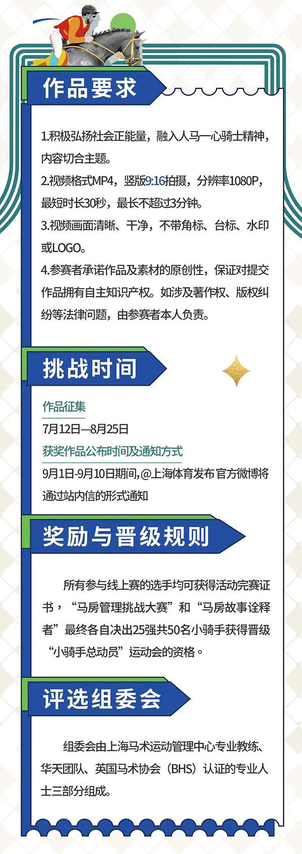 鐺鐺鐺! 馬蹄鐵已敲響! 來(lái)吧! 你的馬房管理挑戰(zhàn)大賽 正式開(kāi)啟! 跟隨小體來(lái)一探究竟! “小騎手總動(dòng)員”招募令 本次大賽面向全網(wǎng)征集,請(qǐng)仔細(xì)閱讀圖文中內(nèi)容、拍攝“馬房管理挑戰(zhàn)”主題視頻或“馬房故事詮釋者”主題視頻參與活動(dòng),大家在獲得參賽證書(shū)的同時(shí),還有機(jī)會(huì)繼續(xù)晉級(jí),參與線(xiàn)下組織的“小騎手總動(dòng)員”運(yùn)動(dòng)會(huì),并最終獲得與華天面對(duì)面交流的機(jī)會(huì)。大賽正式開(kāi)始,我們等你來(lái)挑戰(zhàn)! 在上海市體育局、上海市慈善基金會(huì)和上海市體育發(fā)展基金會(huì)體育文化專(zhuān)項(xiàng)基金的鼎力支持下,“華天·人馬一心”馬術(shù)教育公益項(xiàng)目將繼續(xù)在2023年推出一系列線(xiàn)上線(xiàn)下活動(dòng):“馬語(yǔ)學(xué)前班公開(kāi)課”將為青少年開(kāi)啟馬術(shù)世界的一扇窗;充滿(mǎn)趣味且干貨滿(mǎn)滿(mǎn)的“華天來(lái)了第二季-基礎(chǔ)騎姿”系列視頻;跟蹤小騎手和他們的馬術(shù)小白兄弟姐妹一天的真人秀“OG與小白”,以及大家都可以一試身手的線(xiàn)上“馬房管理挑戰(zhàn)大賽”,實(shí)力展示馬房管理本領(lǐng),以及本公益項(xiàng)目第二年即將出爐的新活動(dòng)“小騎手總動(dòng)員運(yùn)動(dòng)會(huì)”和“華天見(jiàn)面會(huì)”! 了解以上活動(dòng)詳情,請(qǐng)關(guān)注“上海體育發(fā)布”微博、“上海體育”微信、視頻號(hào)、抖音號(hào),以及“@AlexHuaTian華天”微博、“華天的馬房”微信、視頻號(hào)、小紅書(shū)、嗶哩嗶哩等社交媒體。十分期待大家的參與,我們不見(jiàn)不散! (上海體育) |