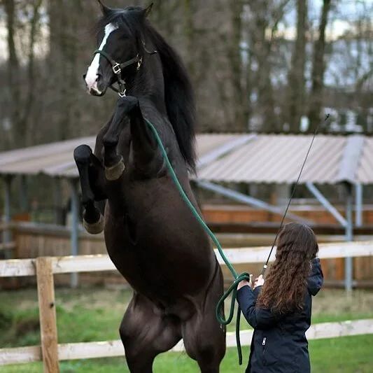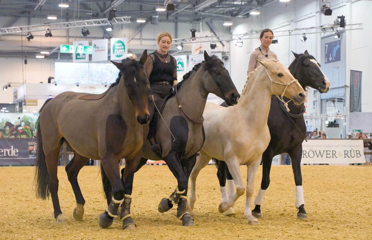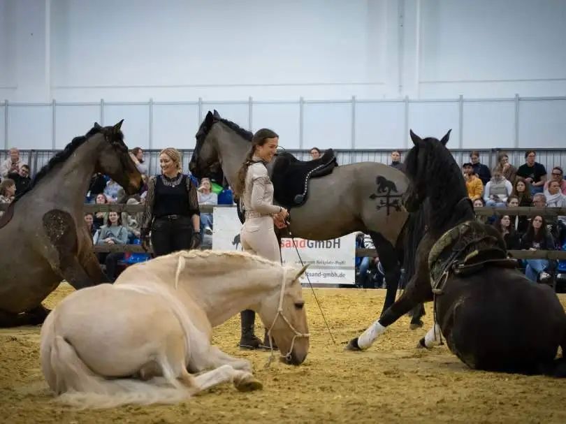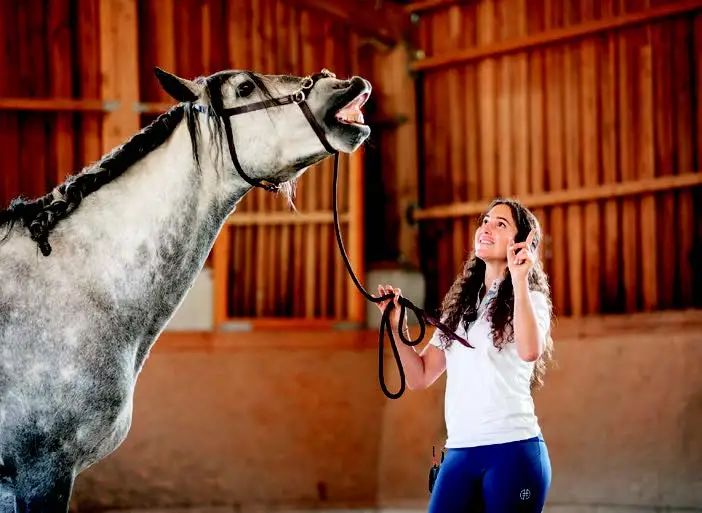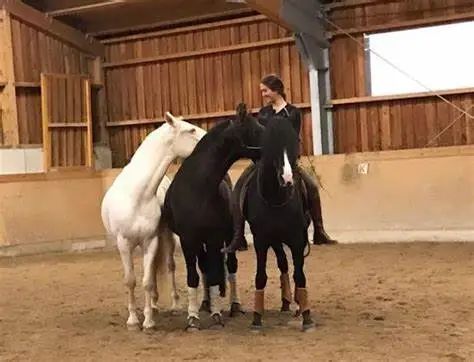 在2025年3月的德國(guó)埃森世界馬術(shù)博覽會(huì)上,《馬術(shù)》雜志記者目睹了肯齊·迪斯利(Kenzie Dysli)展示她那獨(dú)特的自由馬術(shù)技藝。她與多匹駿馬共同舞動(dòng),每一次輕盈的步伐和靈動(dòng)的指令,都是心靈與馬匹之間深刻對(duì)話的演繹。 本文是她在調(diào)馴馬匹方面的見(jiàn)解與理念,揭示了人應(yīng)如何通過(guò)無(wú)形的默契與堅(jiān)實(shí)的信任,建立起與馬匹之間的完美連接。 1. 自由訓(xùn)練的基礎(chǔ) 要與兩匹馬一起訓(xùn)練,它們當(dāng)然都應(yīng)該已經(jīng)各自學(xué)會(huì)了自由訓(xùn)練的各種基本要素。每匹馬都有自己的天賦,并非每個(gè)練習(xí)都適合所有馬。但“引導(dǎo)練習(xí)”的基礎(chǔ)和反射點(diǎn)應(yīng)該已經(jīng)能夠在自由狀態(tài)下很好地執(zhí)行。 如果你的馬總是想著走自己的路,那它肯定還沒(méi)有準(zhǔn)備好與第二匹馬一起訓(xùn)練。因?yàn)榕c兩匹馬訓(xùn)練意味著你必須分配你的注意力——你不能像單獨(dú)訓(xùn)練時(shí)那樣完全專(zhuān)注于每匹馬。 ? Kenzie Dysli 如果你的馬會(huì)在你疏忽的時(shí)候趁機(jī)偷懶,那你就需要加強(qiáng)你們之間的聯(lián)系,以此讓它跟隨在你身邊。和其他訓(xùn)練一樣,基礎(chǔ)打得越扎實(shí),后續(xù)訓(xùn)練就會(huì)越容易。 因此,確保你的馬能夠自己保持在一個(gè)“使其舒適的位置”,特別是當(dāng)馬處在右側(cè)引導(dǎo)位置的時(shí)候,它的頭應(yīng)始終保持在肩部的高度,自然放松。為了檢查馬的這一狀態(tài),你最好不斷地變化步伐。因?yàn)轳R必須與你一起思考并適應(yīng)你的速度。 最好在有干擾的情況下進(jìn)行這項(xiàng)訓(xùn)練。因?yàn)榈诙ヱR也會(huì)成為一個(gè)干擾因素。如果你想第一次訓(xùn)練時(shí)盡可能簡(jiǎn)單,建議不要讓兩匹馬都精神飽滿地開(kāi)始訓(xùn)練。 它們應(yīng)該能夠集中注意力并保持動(dòng)力,但做一些預(yù)熱的運(yùn)動(dòng)(例如在牽引機(jī)上、場(chǎng)地內(nèi)或長(zhǎng)韁訓(xùn)練等)有助于讓它們冷靜下來(lái),因?yàn)橛行R對(duì)適應(yīng)一些新規(guī)則會(huì)有困難。 2. 遵守管理規(guī)則 ?Laura Graves 對(duì)馬而言,群體成員之間的等級(jí)關(guān)系必須明確。這是確保和平與和諧的唯一方式。畢竟,大規(guī)模的爭(zhēng)斗會(huì)消耗這類(lèi)動(dòng)物不必要的精力。 但在開(kāi)始時(shí),馬與馬之間偶爾可能還是會(huì)有點(diǎn)爭(zhēng)執(zhí),而我們不希望這種情況出現(xiàn)在我們的訓(xùn)練中。 一方面,我們希望將馬和人受傷風(fēng)險(xiǎn)降到最低,另一方面,我們希望馬能集中精力一起活動(dòng),而不是互相爭(zhēng)吵。因此,確保你作為“主導(dǎo)動(dòng)物”的位置對(duì)你的馬來(lái)說(shuō)是明確的,這一點(diǎn)極為重要。 肯齊·迪斯利(左)與助手在 2025 年 3 月德國(guó)埃森世界馬術(shù)博覽會(huì)上為觀眾展示引領(lǐng)多匹馬的自由馬術(shù) ? 何亦紅 當(dāng)然,如果這兩匹馬已經(jīng)互相認(rèn)識(shí)并且相互喜歡,那就更容易一些。但即使是互不認(rèn)識(shí)的馬,只要讓它們遵守一個(gè)規(guī)則——訓(xùn)練期間不得發(fā)生爭(zhēng)斗,并且所有馬都接受這一規(guī)則,自由調(diào)馴工作也是可以進(jìn)行的。但請(qǐng)勿冒險(xiǎn)! 你的馬能夠感知你的疑慮,并在猶豫時(shí)利用這一點(diǎn)。直到你有了經(jīng)驗(yàn)和整體把握,知道哪些事情最重要時(shí),最好站在安全的一方?!鞍踩谝弧钡脑瓌t永遠(yuǎn)沒(méi)有錯(cuò)! 但如果兩匹馬相處融洽,并且自由調(diào)馴工作已經(jīng)有了基礎(chǔ),那么你就可以開(kāi)始真正的訓(xùn)練了。 3. 兩匹馬,雙倍的快樂(lè)! ? Kenzie Dysli 開(kāi)始自由工作時(shí),最好從馬的左側(cè)開(kāi)始。對(duì)大多數(shù)馬來(lái)說(shuō),這一側(cè)更加直觀,因?yàn)槲覀儙缀跛胁僮鞫际菑倪@一側(cè)進(jìn)行的,而你的馬也已經(jīng)很熟悉這種帶領(lǐng)位置。 現(xiàn)在,只需將第二匹馬放在第一匹馬的右側(cè),這樣兩匹馬仍然保持通常的舒適位置。一如既往,剛開(kāi)始時(shí)要多加表?yè)P(yáng),以便從一開(kāi)始就對(duì)每一個(gè)正確的動(dòng)作產(chǎn)生積極反饋。和單獨(dú)訓(xùn)練一樣,剛開(kāi)始時(shí),你應(yīng)該牽引兩匹馬,便于更好地影響它們。 哪匹馬在內(nèi)側(cè),哪匹馬在外側(cè),取決于它們的性格。外側(cè)的馬在開(kāi)始時(shí)自然承擔(dān)了稍重的任務(wù),因?yàn)槟愕倪B接變得更寬了。因此,確保沒(méi)有馬開(kāi)始打架。 ? Kenzie Dysli 剛開(kāi)始時(shí),先練習(xí)一只手,建立安全的“停止”和“來(lái)”指令,以確保在任何情況下都能有一個(gè)“停機(jī)”按鈕。之后,你也可以換手進(jìn)行訓(xùn)練。記住,剛開(kāi)始時(shí)的目標(biāo)不是速度,而是確保每個(gè)動(dòng)作的執(zhí)行都干凈利落。 步伐和隨之而來(lái)的更大動(dòng)力是隨著時(shí)間而逐漸發(fā)展的。你還可以讓兩匹馬彼此跟隨,而不是并排行走。但要注意,它們必須已經(jīng)在單獨(dú)訓(xùn)練中與你的位置保持一致,并在你靜止時(shí)能繞你走圈。 三匹馬一起做一些聯(lián)合的馬術(shù)技巧(如西班牙步同步進(jìn)行)也能非常有趣!實(shí)際上,你的想象力沒(méi)