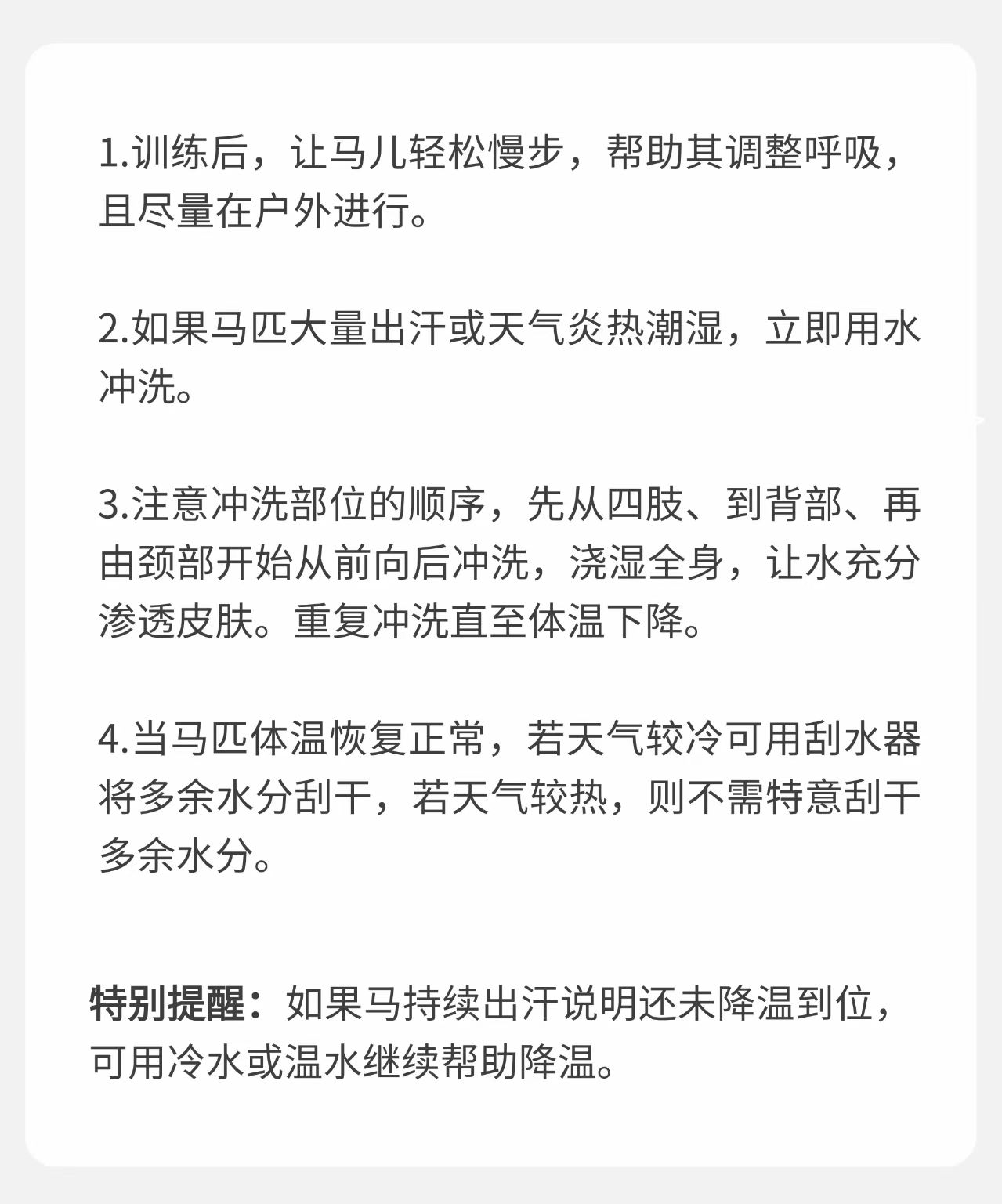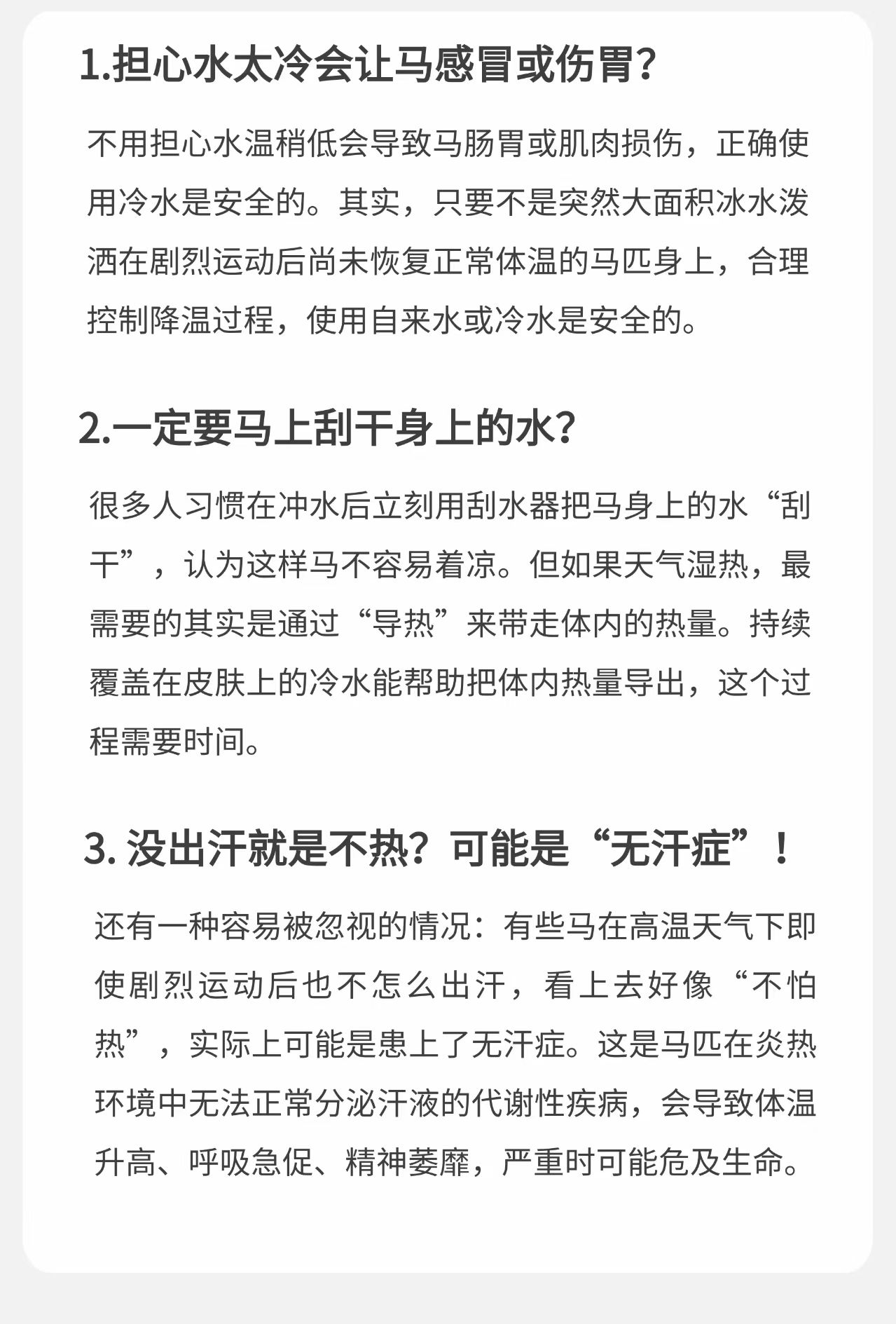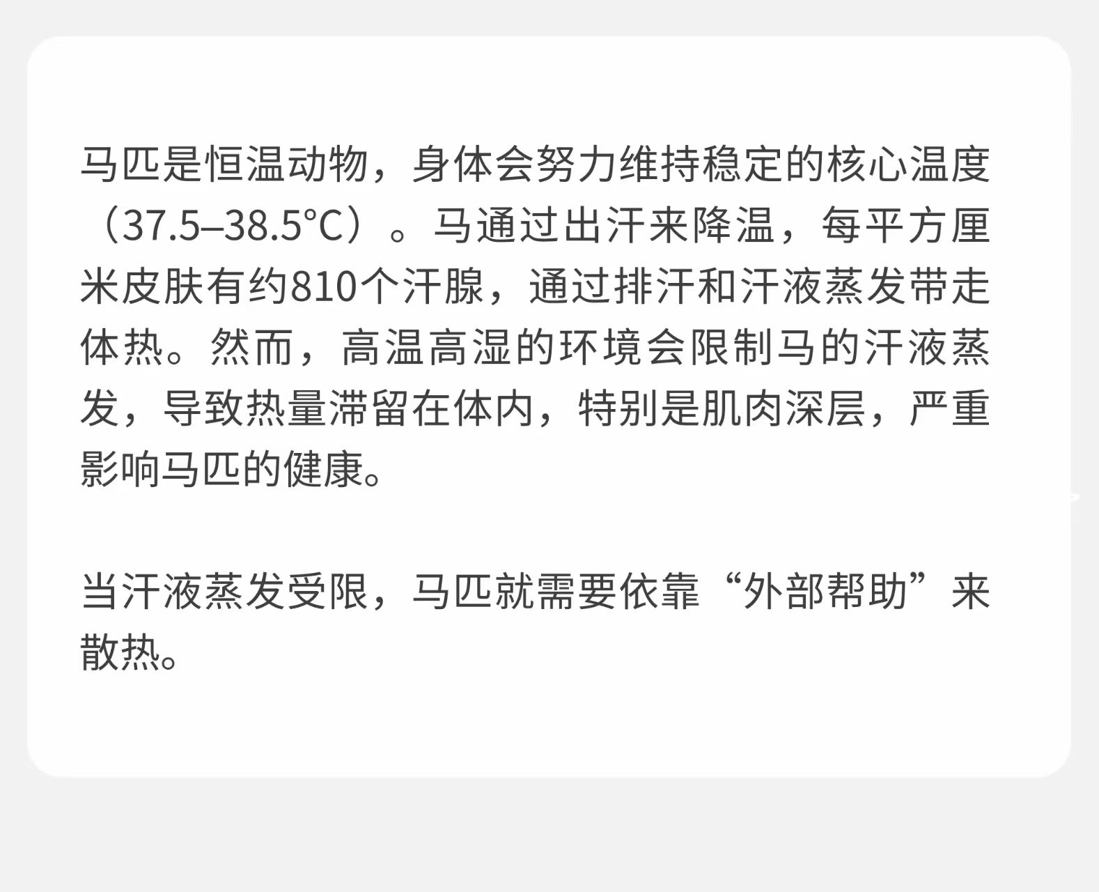 隨著夏季氣溫節(jié)節(jié)攀升,馬匹的健康管理顯得尤為重要。你是否也曾在烈日下為馬兒是否太熱、猶豫該不該沖水和刮水?哪種降溫方式更高效? 別擔心!本文將從生理機制、實用技巧和科研分析各個方面,全面梳理馬在高溫下的降溫方法與誤區(qū)。 無論你是馬主、教練還是騎手,這都是一份不容錯過的夏日守護指南。 高溫環(huán)境下,科學、及時降溫能極大減少馬匹因熱應激造成的傷害。合理利用冷水持續(xù)沖洗、適當運動調(diào)節(jié)呼吸、及時觀察體溫和行為變化,是每個馬主必備的技能。給馬降溫不是麻煩事,這個夏天,讓我們一起守護馬的舒適與安全! |