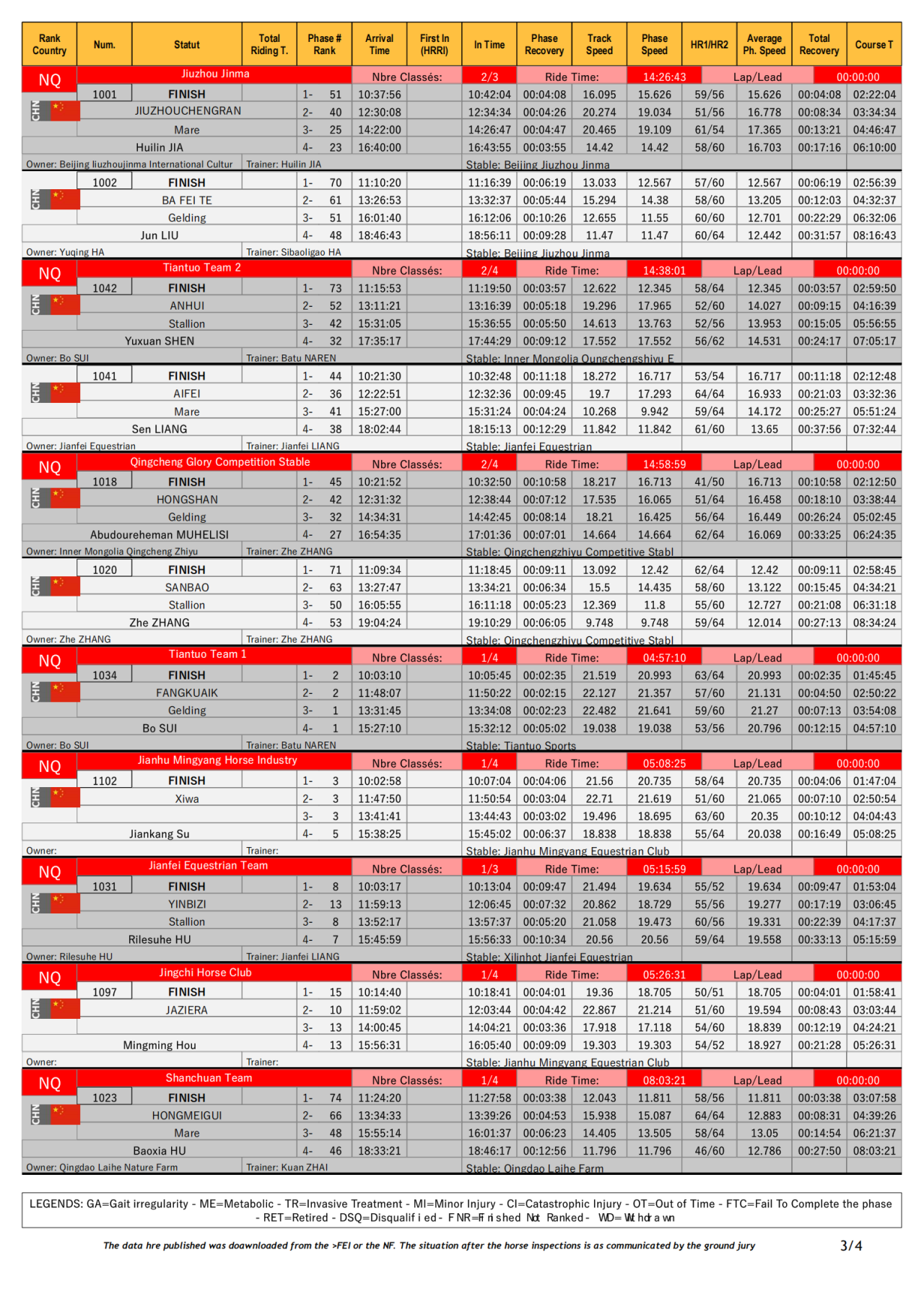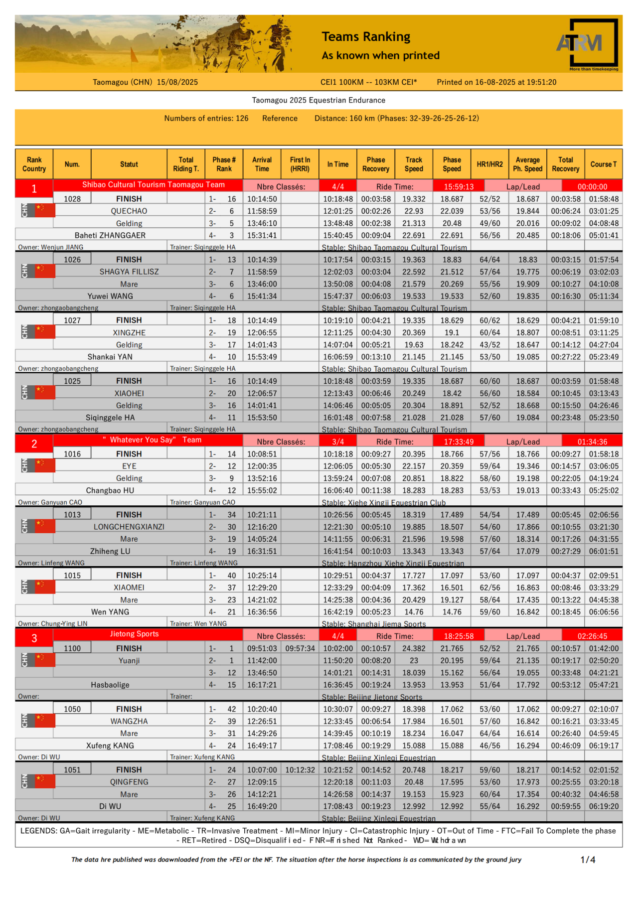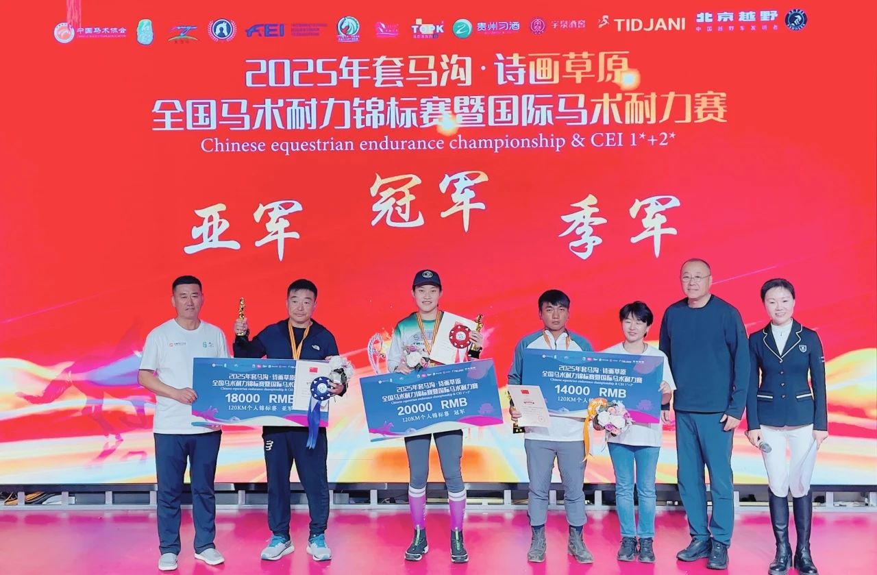 8月17日,全國馬術(shù)耐力錦標(biāo)賽暨國際馬聯(lián)(FEI)二星級馬術(shù)耐力賽在內(nèi)蒙古自治區(qū)包頭市達(dá)茂聯(lián)合旗套馬溝田園綜合體正式開賽。 120KM錦標(biāo)賽&國際馬聯(lián)CEI2* CIM 來自北京京馳馬會的騎手石夢慈(騎手號:2026)搭檔“煥影”一路領(lǐng)先,在賽段3時(shí)排名短暫落后到第二,隨后在賽段4重新回到第一,以19.5km/h的平均時(shí)速完賽,拿下了本場賽事的冠軍。 來自直隸馬會的騎手瞿云飛(騎手號:2016)搭檔“我來了”和來自克什克騰旗烏蘭布統(tǒng)馬會的騎手魏金昆(騎手號:2012)搭檔“哈里”分別落后冠軍15秒和18秒,以同樣19.5km/h的平均時(shí)速獲得亞軍和季軍。 120KM錦標(biāo)賽&國際馬聯(lián)CEI2* CIM賽頒獎(jiǎng)典禮 頒獎(jiǎng)嘉賓:中國馬術(shù)協(xié)會副秘書長、 競賽部部長孫立生先生(右二) 今年16歲的石夢慈接觸耐力賽一年,與“煥影”共同訓(xùn)練了1個(gè)月,她表示,這次的賽道較難,對自己和馬來說都有一定挑戰(zhàn)性。此次奪冠,她非常感謝北京京馳馬會強(qiáng)大的后援團(tuán),也特別感謝父母的支持與陪伴。 石夢慈接受采訪 賽后數(shù)據(jù)顯示,冠軍石夢慈與“煥影”在完成比賽各賽段后,心率恢復(fù)到規(guī)定標(biāo)準(zhǔn)所需的時(shí)間為全場最短;季軍魏金昆搭檔“哈里”在賽段4達(dá)到了24.6km/h的全場最高時(shí)速。 8月16日團(tuán)體賽成績公布 石寶文旅套馬溝隊(duì)獲得100KM錦標(biāo)賽團(tuán)體冠軍,隊(duì)員包括:丈嘎爾·巴合提(搭檔“雀巢”)、王玉偉(搭檔“瑞雪”)、嚴(yán)山凱(搭檔“行者”)和哈斯青格樂(搭檔“小黑”)。 |