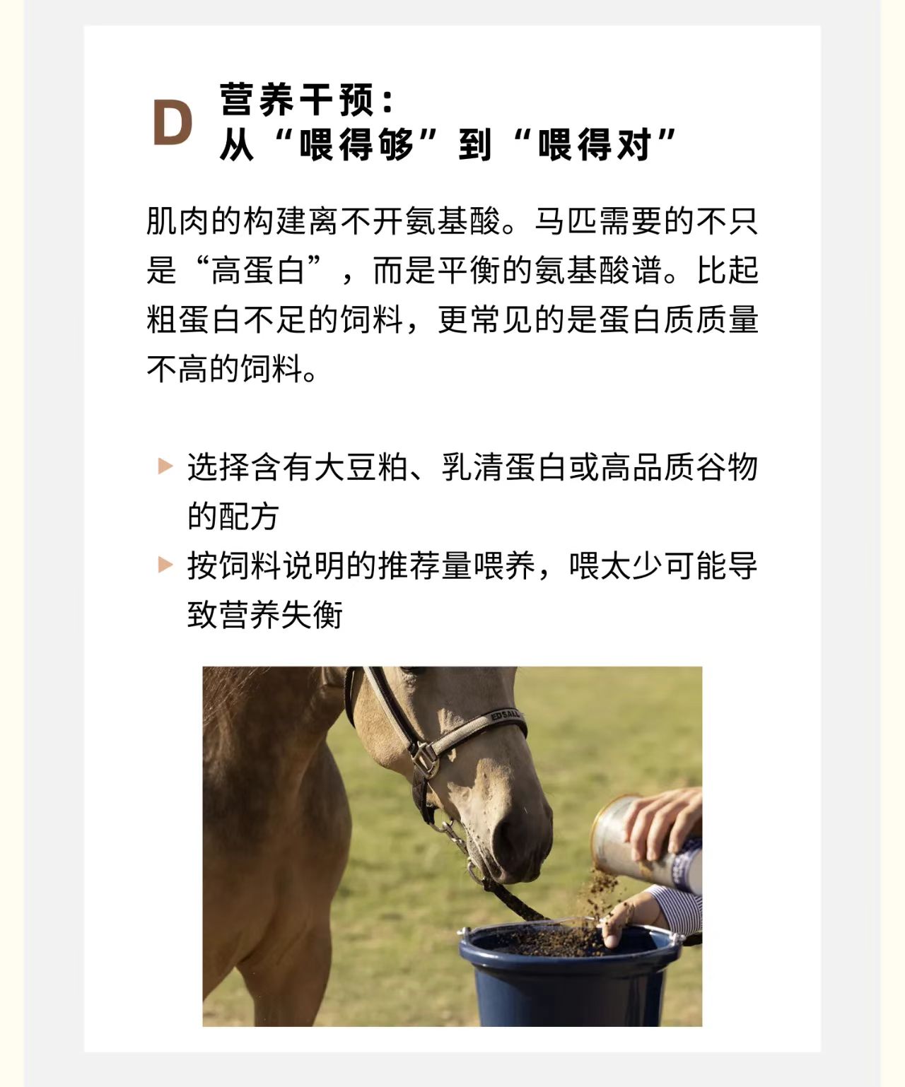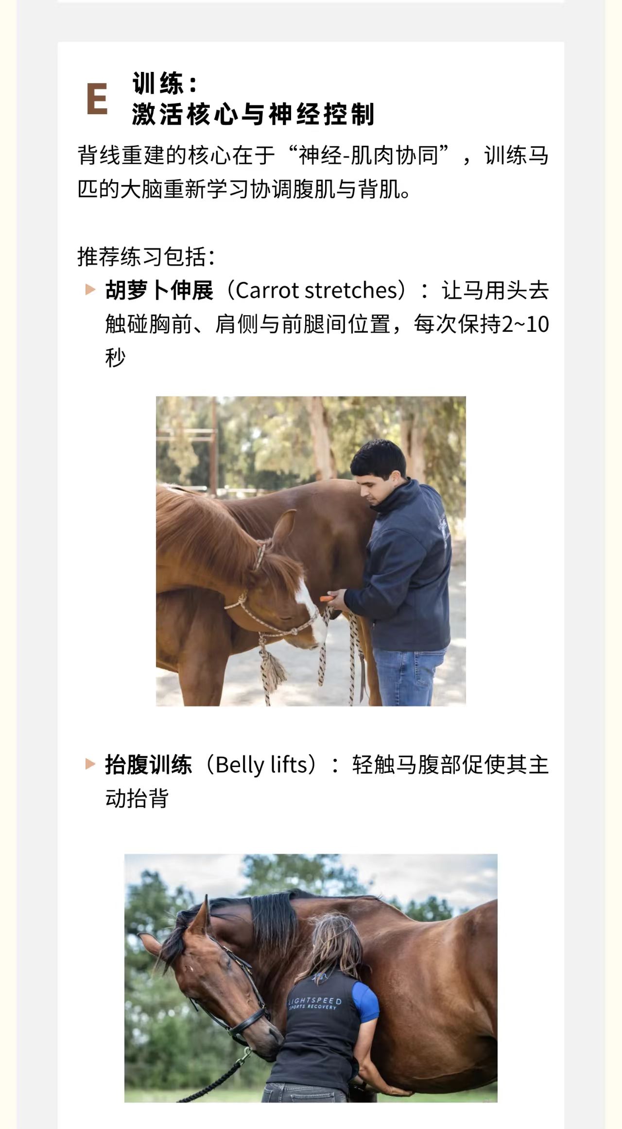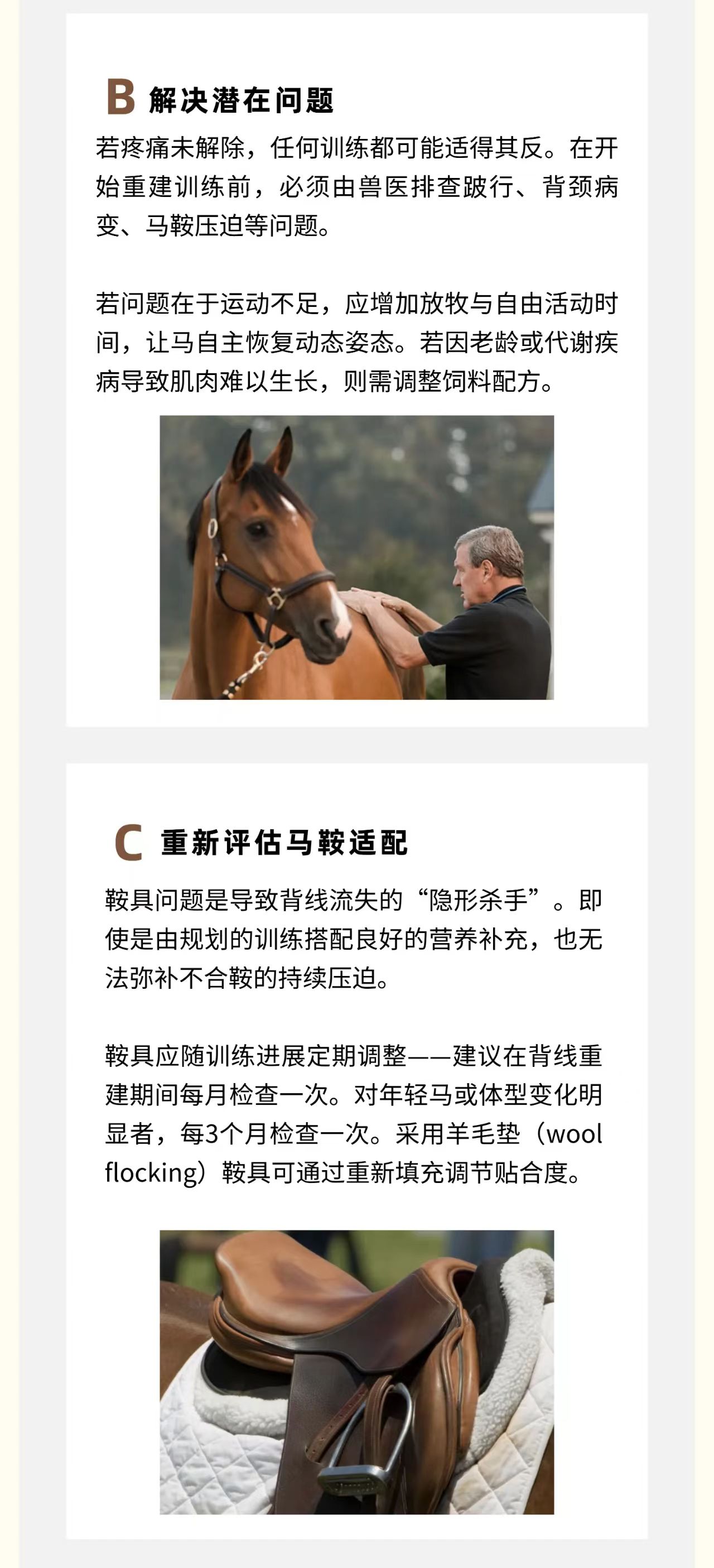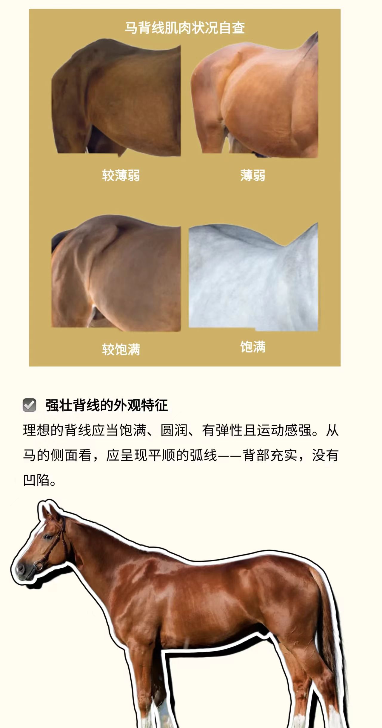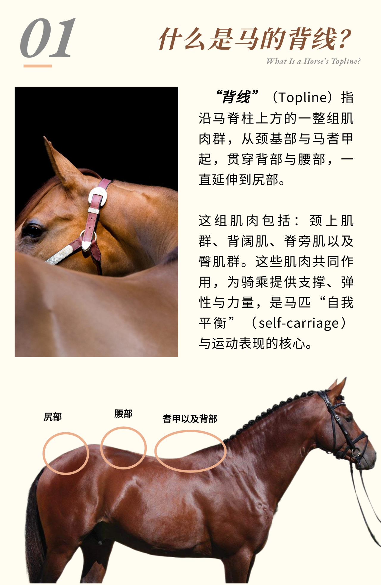 為什么“背線”(Topline)如此重要? 對于一匹馬而言,背線不僅僅是一條優(yōu)美的輪廓。它是力量的傳導線,是平衡的支點,是承載騎乘與表現(xiàn)的核心結構。 擁有強壯的的背線,意味著馬能在運動中更好地從后軀發(fā)力,背部自然抬升,騎乘舒適穩(wěn)定。如何判斷馬的背線是否健康?又該如何讓它重新建立力量?本文將從結構、原因與訓練三方面,帶你深入了解馬的背線。 背線的狀態(tài)不僅反映美觀,更是健康、舒適與長期運動能力的晴雨表。背線問題往往反映了姿態(tài)與核心穩(wěn)定性的失衡,而非單純的訓練不足。當它從塌陷變得飽滿,當背部能自然抬起、身體在平衡中延展,這不只是馬匹健康的信號,更是騎手與馬匹之間擁有良好溝通的體現(xiàn)。 |