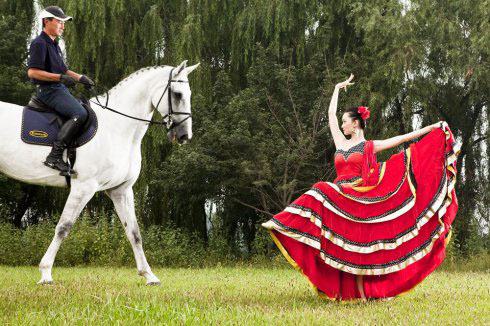 作為一項優(yōu)雅與智慧并重的馬術(shù)運動,人馬合一才是王道。人與馬,都是大自然巧奪天工的完美藝術(shù)品,在最自然的天空下完成人馬合一,翩翩起舞,別有一番風(fēng)情。 馬術(shù)運動的盛裝舞步項目,是人類借助最自然的生命之美,將馬精雕細(xì)琢之后,讓它走出頗具藝術(shù)性和觀賞性的舞步。在比賽中,根據(jù)規(guī)則,無論動作多厶復(fù)雜多變,人和馬都必須顯得氣定神閑、風(fēng)度翩翩,表現(xiàn)出騎乘藝術(shù)的最高境界。甚至在最高級別的盛裝舞步比賽時,騎手和馬匹往往會沉浸在音樂的悠揚中,自由演繹,肆意地享受著那渾然天成的自編舞。 弗拉明戈舞.同樣是在最自然的條件下衍生的舞蹈,熱情奔放、自由、熱情?!案ダ鞲辍辈粌H是歌(cante)、舞(baile)和吉他音樂(toque)的三合一藝術(shù),也被用來形容一種人生態(tài)度。在藝術(shù)家心中,“弗拉明戈”代表著種慷慨、狂熱、豪放和不受拘束的生活方式。 有人說,弗拉明戈是最能享受音樂,將音樂演繹得最精確的舞蹈。隨著音樂表現(xiàn)的變化,舞者的肢體表現(xiàn)也隨之哀凄、歡愉,仿佛作著靈魂最深處的展現(xiàn)。在整個表演過程中,舞者和觀眾都在享受心靈的相通。 這恰和我們馬術(shù)中的盛裝舞步有著異曲同工之妙,騎手與馬匹,舞者與觀眾,我們都在尋求一種心靈的融通,與心靈共舞。今天,我們專門請來了東方歌舞團(tuán)的徐萌老師,奧運騎手黃祖平老師和他的愛馬,用最女人的舞蹈與最典雅的馬術(shù),共同描繪了一場人馬共舞的精彩畫面。 文/易達(dá)黎 |