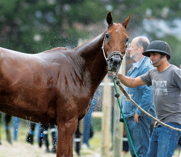 眾所周知,馬球是一項(xiàng)規(guī)則苛刻且對(duì)抗激烈的運(yùn)動(dòng)。這項(xiàng)運(yùn)動(dòng)對(duì)騎手和馬匹都有著嚴(yán)格的要求,并不是所有的馬匹都可以勝任馬球運(yùn)動(dòng)。優(yōu)秀的馬球馬擁有一定的先天優(yōu)勢(shì),比如說(shuō)四肢強(qiáng)健、速度快、耐力好、敏捷、平衡感強(qiáng)等等,其中,最后兩個(gè)是馬球馬的重要特征。另外,馬球馬的性格要溫順而勇敢。如果覺(jué)得你的馬性情不穩(wěn)定,那它一開(kāi)始就會(huì)帶來(lái)麻煩。 教你正確挑選馬球馬 挑選馬球馬要“遠(yuǎn)看其勢(shì),近看其質(zhì)”。首先離遠(yuǎn)一點(diǎn)觀(guān)察馬整個(gè)的身體結(jié)構(gòu),它應(yīng)該給你的大致感覺(jué)是愉快活潑并且身材勻稱(chēng)的。接著慢慢走近它,試圖觀(guān)察它身體的每一部分與整體的關(guān)系。馬球馬要有一雙善良的眼睛、一對(duì)擅于聆聽(tīng)的耳朵、要機(jī)敏、頭部不能受過(guò)傷。 通常認(rèn)為馬球馬的頸部與頭部銜接處要細(xì),因?yàn)榧?xì)脖子馬匹的血統(tǒng)更純正、奔跑能力更強(qiáng)同時(shí)也順從、容易駕馭。此外,強(qiáng)健的四肢和敏捷的頭顱以及脖頸可以幫助馬匹尋找平衡感。另外,馬球馬最好是低肩隆并具備傾斜和強(qiáng)壯的肩部,這樣的馬匹容易控制、反應(yīng)敏捷,騎起來(lái)不僅平穩(wěn),而且易于讓球手擊球。 馬球馬的腿部最好擁有輪廓清晰的肌腱和韌帶,馬蹄應(yīng)該大小一致并且堅(jiān)實(shí)。馬球馬胸圍的尺寸表現(xiàn)出馬匹的強(qiáng)壯與耐力:胸圍寬證明該馬匹的心肺分布均勻、體格健壯。馬匹后背短,這樣身長(zhǎng)就短,對(duì)打后手球以及尾部擊球有好處。同時(shí),越矮,腿越短的馬球馬更為強(qiáng)健,力量也大。 此外,臀部結(jié)實(shí)有力、后肢大腿發(fā)育良好、后膝關(guān)節(jié)強(qiáng)壯的特點(diǎn)都展示出了馬球馬強(qiáng)大的爆發(fā)力。因?yàn)樵诩ち业谋荣愔?,?jīng)常會(huì)出現(xiàn)讓馬急走、急停、急轉(zhuǎn)的情況,而這一系列的動(dòng)作幾乎是在六便士硬幣大小的土地上完成的。另外,馬球馬的肘部是前身主要發(fā)力點(diǎn),所以這個(gè)部位要粗壯、筆直并且有力。馬球馬的后肢還應(yīng)該擁有強(qiáng)健而平直的骨骼,這樣它就可以隨時(shí)準(zhǔn)備起跳或者躲閃。從背面觀(guān)察馬匹,它的臀部和馬蹄應(yīng)該構(gòu)成一個(gè)矩形的形狀。 現(xiàn)在,你已經(jīng)從正面、側(cè)面和背面仔細(xì)地觀(guān)察了馬球馬的身體結(jié)構(gòu),在你腦海里對(duì)于馬球馬應(yīng)該呈現(xiàn)這樣一種圖像:一個(gè)容納了如運(yùn)動(dòng)員般的速度和力量的方正“小盒子”。 特別需要注意的是,不少馬球新手想要買(mǎi)退役的純血馬來(lái)做自己的馬球馬。如果你也這樣想,那么請(qǐng)記住這種馬在真正接受馬球馬訓(xùn)練之前至少需要進(jìn)行1至2年時(shí)間的重塑訓(xùn)練。換句話(huà)說(shuō),在你知道這匹退役純血馬是否能做馬球馬之前,你已經(jīng)至少在它身上浪費(fèi)了3至4年的時(shí)間了。另外,大多數(shù)馬球新手都對(duì)自己的馬抱有美好的憧憬,想象中它們威風(fēng)凜凜、桀驁不馴,所以他們選的馬也是能力較高的,但到頭來(lái)卻發(fā)現(xiàn)自己還沒(méi)有能力駕馭它們。因此,一開(kāi)始還是應(yīng)該選擇性情溫和的、大致年齡在8到10歲之間、沒(méi)有不良習(xí)慣的馬球馬。10歲的馬并不老,事實(shí)上馬球賽的經(jīng)驗(yàn)讓它們正在生命的黃金時(shí)期。 馬球馬的訓(xùn)練方法 訓(xùn)練成功的馬球馬應(yīng)該具備以下特點(diǎn):力量、耐力、可控的速度、易聽(tīng)從指揮、平穩(wěn)而充滿(mǎn)爆發(fā)力的飛奔。然而想達(dá)到這樣的標(biāo)準(zhǔn)是需要花費(fèi)訓(xùn)練師很長(zhǎng)時(shí)間的。 在接觸馬球運(yùn)動(dòng)之前,馬匹應(yīng)該首先接受過(guò)良好的騎乘訓(xùn)練。它應(yīng)該易于駕馭,輕微的力道就應(yīng)該可以控制它的行動(dòng),不受沖撞、踢腿以及驚嚇的干擾,并且合群、能在混戰(zhàn)中保持沉著冷靜、并愿意為球手爭(zhēng)奪馬球而奮勇前沖。 訓(xùn)練一匹馬球馬要應(yīng)對(duì)很多變化,比如隨著馬匹年齡的增長(zhǎng),它的需求會(huì)有不同。馬球馬一般是在3歲時(shí)開(kāi)始基本訓(xùn)練的,這種訓(xùn)練持續(xù)從6個(gè)月到2年,時(shí)間不等。在這段期間,它們除了要學(xué)會(huì)急走、急停、急轉(zhuǎn)等技巧,還要在崎嶇的土地上不斷練習(xí)以尋找自身的平衡感。如果馬球馬可以將自身重量和騎手的重量合理地分配給四肢(一般是將總體重量60%放在前蹄上,后蹄則承擔(dān)余下40%的重量),在負(fù)重狀態(tài)下它的步態(tài)也是輕盈有力的話(huà),那么這匹馬的平衡感就很好。日常的訓(xùn)練和練習(xí)賽可以幫助馬球馬逐漸增強(qiáng)信心、改善步伐和平衡感,從而促進(jìn)它學(xué)習(xí)控制力量和動(dòng)作。同時(shí),訓(xùn)練師需要通過(guò)各種不同的引導(dǎo)“告知”馬匹,馬球是一項(xiàng)有趣的運(yùn)動(dòng),并引領(lǐng)它們愛(ài)上馬球運(yùn)動(dòng),這一點(diǎn)至關(guān)重要。 一旦馬匹有了基本的調(diào)教,它就可以開(kāi)始認(rèn)識(shí)馬球裝備了,但是要循序漸進(jìn)地、友善地