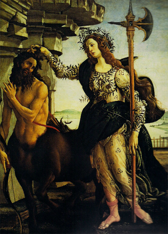 桑德羅·波提切利(1444/1445年-1510年),《帕拉斯與肯陶洛斯》1485年左右 蛋黃涂料,木制油畫(huà)207×148 cm佛羅倫薩,烏菲茲美術(shù)館 提到有關(guān)肯陶洛斯族馬人的神話傳說(shuō),人們馬上就會(huì)想到不騎馬文化中的騎士。早期的游牧民族往往被描述為暴戾好斗,這種個(gè)性正好解釋了起初肯陶洛斯族馬人為什么總是被冠以野蠻的名聲。盡人皆知,肯陶洛斯族馬人野蠻、貪婪、狂放不羈且非??膳?。而馬人喀戎和福洛斯則性格平和,是馬人一族中的異類。 這幅作品深得波提切利自己的喜愛(ài)。他描繪了馬人與女神米諾娃(即雅典娜)在一起的形象,從畫(huà)中的馬人身上看不到一絲貪婪之氣。反之,這個(gè)半人半獸顯得十分溫柔、馴服,寓意智慧(米諾娃的象征意義)戰(zhàn)勝了野蠻。 這幅作品和波提切利另一幅著名的《春》創(chuàng)作于同一時(shí)期,也曾懸掛在洛倫佐·德·美第奇位于佛羅倫薩的別墅中。畫(huà)中米諾娃的衣服上纏繞著類似美第奇家族族徽?qǐng)D案的裝飾物。她的原型很有可能是美第奇家族的一位成員。 |