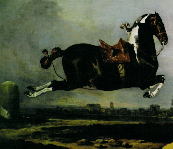 列支敦士登王侯收藏品,由瓦杜茲重返維也納 1700年左右,布面油畫,260.4 cm×211cm 作者:約翰·格奧爾格·馮·漢密爾頓(1672-1737年) 漢密爾頓是18世紀一位勤奮的編年史作者,他曾記載馬匹接受古典馬術訓練的歷史。 這幅作品充滿了不同尋常的自相矛盾之處,一匹健壯的花斑牡馬,正自覺地表演馬術訓練中的Levade(馬術表演中的一種動作,馬前肢揚起,身體成45度角向前傾斜,然后騰空后蹄),Levade是“馬術跳躍練習” (簡單來說就是一系列控制下的跳躍動作)中最初級的動作,是其它復雜的馬術訓練課程的基礎。也就是說,畫家描繪了一匹駿馬,它未受人約束,但卻完成了一個原本需要指令的古典馬術動作。不管以前還是現在,西班牙駿馬最適合表演對身體和精神都有著嚴格要求的傳統(tǒng)馬術動作。雖然現在提起馬術表演,人們大多會想起傳統(tǒng)的白色利比扎馬,但在18世紀非常流行用雜色或身帶花斑的西班牙駿馬進行馬術表演。 |