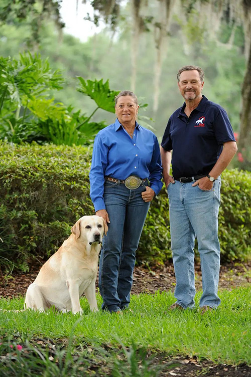 如果你的馬兒存在以上行為,你就需要誠實地評估一下你和馬兒的伙伴關(guān)系了。你可能不想成為馬兒的領(lǐng)導(dǎo)者——你想成為ta天真無邪的伙伴或朋友。但人類有人類的思路,馬有馬的想法——馬天生會在大腦里認(rèn)定一個領(lǐng)導(dǎo)者。 誰是領(lǐng)導(dǎo)者? 如果你意識到你的馬兒有過以上行為,且這是ta的習(xí)慣性行為,其實ta已經(jīng)告訴你ta怎么看待你們之間的關(guān)系了——ta認(rèn)為自己是領(lǐng)導(dǎo)者。 馴馬師兼馬臨床獸醫(yī)林恩·帕姆(Lynn Palm)說:“如果一匹馬在地面上就占據(jù)了主導(dǎo)地位,這種關(guān)系就會轉(zhuǎn)移到馬上。ta推你一次,下次就擠得更兇。這次ta推你,你讓ta一步,下次你就要讓ta三步?!?/div> Lynn Palm(左)和Cyril Pittion-Rossillon (右) 二人在美國加州共同經(jīng)營著Fox Grove Farm,提供以盛裝舞步為基礎(chǔ)的教學(xué),在多國開設(shè)了馬診所 帕姆幫助過很多馬主了解馬并通過肢體語言和馬交流。她發(fā)現(xiàn)一匹馬在馬下咄咄逼人和不尊重人的基本原因有兩個: