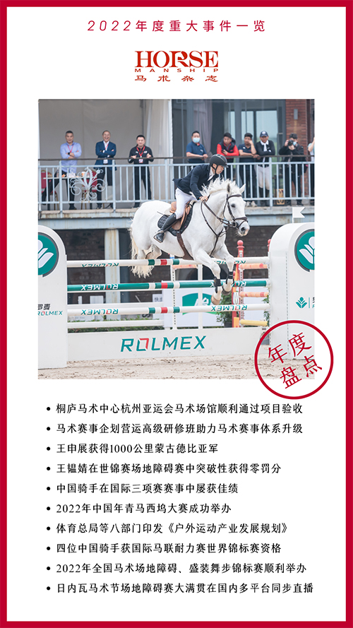 伴隨著疫情緩和,馬術(shù)行業(yè)迎來了令人期待的2023年。馬術(shù)行業(yè)的伙伴們與《馬術(shù)》雜志和馬術(shù)在線也一起,又走過了一年。這一年,有許多值得回憶的年度馬圈大事件,就讓我們一起朝花夕拾,共憶流年。 1、桐廬馬術(shù)中心杭州亞運(yùn)會(huì)馬術(shù)場館順利通過項(xiàng)目驗(yàn)收 2022年3月30日,中國農(nóng)業(yè)農(nóng)村部官網(wǎng)發(fā)布信息,世界動(dòng)物衛(wèi)生組織(OIE)審核通過并公布中國浙江省杭州市桐廬縣無規(guī)定馬屬動(dòng)物疫病區(qū),標(biāo)志著桐廬成為中國內(nèi)地第二個(gè)獲國際認(rèn)可的馬匹“無疫區(qū)”。這使得將來中國引進(jìn)更多高級(jí)別國際馬術(shù)賽事具備了充分的條件。 2、馬術(shù)賽事企劃營運(yùn)高級(jí)研修班助力馬術(shù)賽事體系升級(jí) 由中國馬術(shù)協(xié)會(huì)主辦,香港賽馬會(huì)贊助,《馬術(shù)》雜志承辦,中馬聯(lián)合傳媒執(zhí)行的馬術(shù)賽事企劃營運(yùn)高級(jí)研修班于2022年6月20-22日舉行。此次研修班是國內(nèi)首次舉辦的馬術(shù)賽事企劃營運(yùn)主題的線上研修課程,進(jìn)一步規(guī)范了中國馬術(shù)賽事策劃運(yùn)營方面的工作,將大大推動(dòng)馬術(shù)賽事乃至馬術(shù)運(yùn)動(dòng)的推廣和普及,助力馬術(shù)產(chǎn)業(yè)賽事運(yùn)營體系轉(zhuǎn)型升級(jí)。 3、王申展獲得1000公里蒙古德比亞軍 2022年當(dāng)?shù)貢r(shí)間8月10日10時(shí)出發(fā),8月17日16時(shí)19分抵達(dá),來自中國北京的女孩,王申展連續(xù)8天,每日騎行10多個(gè)小時(shí),與來自12個(gè)國家的46名騎手一起,挑戰(zhàn)了被人們視為世界最長、最艱辛的馬術(shù)耐力賽賽事之一的蒙古德比,并最終收獲亞軍成績。 蒙古德比是一場1000公里的馬背冒險(xiǎn)競賽,穿越了蒙古草原,騎手每35-40公里需要換一匹馬,需要在極端條件下照顧自己并獨(dú)立導(dǎo)航尋找最近路線,這些元素讓蒙古德比成為了一場馬背冒險(xiǎn)之旅,也吸引了一批批冒險(xiǎn)家與騎手來到這里。 4、王韞婧在世錦賽場地障礙賽中突破性獲得零罰分 丹麥當(dāng)?shù)貢r(shí)間8月11日,國際馬聯(lián)世界錦標(biāo)賽場地障礙個(gè)人及團(tuán)體資格賽第二場在海寧上演。本場比賽共有34個(gè)國家和地區(qū)的103對(duì)人馬組合參賽。值得一提的是,中國騎手王韞婧是首位獲得世錦賽場地障礙參賽資格的騎手。 王韞婧和“Quidamia D”第20位登場,她們整個(gè)路線行進(jìn)過程穩(wěn)定流暢,以零罰分完賽,完賽時(shí)間定格在85.68秒。這是中國大陸騎手首次在1.60米五星級(jí)比賽中獲得零罰分。 5、中國騎手在國際三項(xiàng)賽賽事中屢獲佳績 荷蘭當(dāng)?shù)貢r(shí)間4月17日,一場國際馬聯(lián)三項(xiàng)賽二星級(jí)長途賽(CCI2*-L)在奧德卡斯帕爾(Oudkarspel)結(jié)束爭奪。中國馬術(shù)三項(xiàng)賽隊(duì)三名騎手孫華東、包英鳳和盧俊宏攜手參賽,東京奧運(yùn)騎手孫華東攜手奧運(yùn)賽駒“Lady Chin van’t Moerven Z”以23.5個(gè)罰分贏得冠軍。亞運(yùn)騎手盧俊宏騎乘奧運(yùn)會(huì)備用賽駒“Teseo”以30.1個(gè)罰分獲得季軍。東京奧運(yùn)騎手、全運(yùn)會(huì)個(gè)人賽冠軍包英鳳搭檔奧運(yùn)賽駒“Flandia 2”以31.1個(gè)罰分排名第四。 4月22至24日,奧運(yùn)三項(xiàng)賽騎手華天在英國凱爾薩爾山國際(Kelsall Hill International)區(qū)域賽上,以總罰分26.5的成績奪冠。這是他繼去年參加在荷蘭舉辦的2022年杭州亞運(yùn)資格賽奪冠后再度取得第一名的好成績。 9月23日至25日,中國騎手梁銳基與馬匹“Kiriaantje”首次配合,在比利時(shí)瓦勒海姆舉行的國際馬聯(lián)三項(xiàng)賽一星級(jí)比賽中脫穎而出,于65對(duì)人馬組合中取得第二名的成績。 孫華東、包英鳳、盧俊宏、華天、梁銳基,中國馬術(shù)三項(xiàng)賽騎手在2022年獲得的成績,為未來備戰(zhàn)杭州亞運(yùn)會(huì)和巴黎奧運(yùn)會(huì)打下了堅(jiān)實(shí)基礎(chǔ)。 6、2022年中國年青馬西塢大賽成功舉辦 2022年11月5日,2022年中國年青馬西塢大賽于北京西塢馬術(shù)落幕。2022年中國年青馬西塢大賽決出了四、五、六、七歲馬組別的年青馬大賽兩輪的冠軍得主,車馬接力賽和成年馬超高賽圓滿舉辦,“最佳種公馬潛質(zhì)獎(jiǎng)”、“最佳調(diào)教師”、“最佳馬主”、“最佳騎手”、“最佳馬工”也決出最終得主。 作為首個(gè)全國溫血馬性能測定場,西塢馬術(shù)在賽前驗(yàn)馬環(huán)節(jié)額外增加了馬匹體尺及影像數(shù)據(jù)采集。 在馬匹調(diào)教、飼養(yǎng)、訓(xùn)練、獸醫(yī)保障等相關(guān)體系滯后的情況下,很多從國外重金進(jìn)口的競賽馬的競技水平會(huì)出現(xiàn)不同程度的下降。在此背景下創(chuàng)辦的年青馬大賽已走過了四年征程,賽事極大促進(jìn)了中國年青馬繁育、調(diào)馴、競賽交流、交易各環(huán)節(jié)的發(fā)展。 7、體育總局等八部門印發(fā)《戶外運(yùn)動(dòng)產(chǎn)業(yè)發(fā)展規(guī)劃》 2022年11月7日,體育總局同發(fā)改委等八部門聯(lián)合發(fā)布了《戶外運(yùn)動(dòng)產(chǎn)業(yè)發(fā)展規(guī)劃(2022-2025年)》,包括冰雪、山地戶外、水上、航空、汽車摩托車、自行車、馬拉松、馬術(shù)等運(yùn)動(dòng)項(xiàng)目?!兑?guī)劃》明