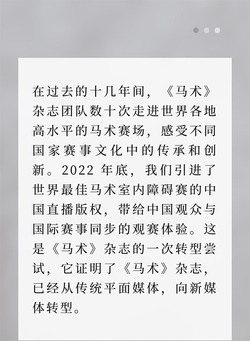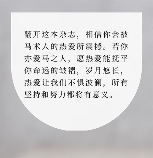 「起步 1982-1998」 內(nèi)蒙古是現(xiàn)代馬術(shù)的起點(diǎn),40年前,相信傳奇教練張漢文先生,一定也是因?yàn)闊釔?ài)才會(huì)將一生奉獻(xiàn)給了馬術(shù)事業(yè)。從內(nèi)蒙古隊(duì)、新疆隊(duì)、西藏隊(duì),再到廣州賽馬場(chǎng),他培養(yǎng)了大量的人才,成為中國(guó)馬術(shù)的奠基人。 「創(chuàng)業(yè) 1998-2008」 有張漢文先生作為引路人,此后內(nèi)蒙古隊(duì)、新疆隊(duì)、西藏隊(duì)、廣東隊(duì)等省隊(duì),開(kāi)始了中國(guó)馬術(shù)人奮勇向前,不懼困苦的道路。 「發(fā)展 2008-2022」 經(jīng)歷了起步期與創(chuàng)業(yè)期的崢嶸歲月,直至 2008 年,申奧成功的火焰點(diǎn)亮了中國(guó)馬術(shù),成為重大的分水嶺,中國(guó)馬術(shù)開(kāi)始向社會(huì)化、國(guó)際化、市場(chǎng)化轉(zhuǎn)變,隨后吸引了更多新生代愛(ài)上馬術(shù)運(yùn)動(dòng),走向職業(yè)化的道路,成為可貴的后備軍。 2006 年,在中國(guó)還很難找到與馬相關(guān)的資料,憑著熱愛(ài),《馬術(shù)》雜志創(chuàng)刊。隨著 2022 年這期中國(guó)馬術(shù) 40 年紀(jì)念刊的完成,《馬術(shù)》也成為了垂直行業(yè)唯一連續(xù)出版 17 年的雜志。 《中國(guó)馬術(shù)40年特刊》的制作周期很長(zhǎng),幾個(gè)月的采訪與拍攝,我們找到了多位 80 年代就開(kāi)始跨上馬背的騎手和從業(yè)者。從少年到古稀,他們一直延續(xù)著馬術(shù)生涯,也是因?yàn)闊釔?ài)。這些成熟騎手有的依舊活躍在高級(jí)別的馬術(shù)賽事中,有的成為教練,或俱樂(lè)部經(jīng)營(yíng)者,推動(dòng)著行業(yè)的發(fā)展,他們是馬術(shù)運(yùn)動(dòng)的寶貴資產(chǎn)。熱愛(ài),不僅是一種生命姿態(tài),更是一種生命能力。 「運(yùn)動(dòng)馬」 馬術(shù)運(yùn)動(dòng)的精髓是馬與騎手之間的合作。有的騎手在采訪期間談到與自己相伴多年的老馬時(shí),甚至潸然落淚。40年的回顧我們也沒(méi)有遺漏這些為推動(dòng)馬術(shù)競(jìng)技水平作出貢獻(xiàn)的馬,我們梳理出了十匹重要的運(yùn)動(dòng)馬,這些擁有著勇敢之心的馬匹,幫助騎手挑戰(zhàn)一個(gè)接一個(gè)的高度,應(yīng)該被記住和懷念。 「青少年」 中國(guó)馬術(shù)還有長(zhǎng)路要走,我們的馬匹繁育調(diào)教水平還處于探索初期,我們青少年人才梯隊(duì)的建設(shè)布局初見(jiàn)端倪,馬術(shù)俱樂(lè)部用地非常不穩(wěn)定,還需政策的支持……而這些都決定著中國(guó)馬術(shù)發(fā)展的質(zhì)量,以及能走多快、能走多遠(yuǎn)。 「外籍教練」 中國(guó)馬術(shù)40年,其實(shí)是個(gè)開(kāi)始。 馬術(shù)運(yùn)動(dòng)的發(fā)展首先需要打開(kāi)眼界去突破認(rèn)知。從 90 年代新疆隊(duì)最早出國(guó)去吉爾吉斯斯坦訓(xùn)練,帶回了先進(jìn)的理念,到其他省區(qū)隊(duì)紛紛走出國(guó)門(mén)去訓(xùn)練與交流,再到之后多位外籍教練進(jìn)入中國(guó),在這個(gè)“走出去,請(qǐng)進(jìn)來(lái)”的過(guò)程里,國(guó)際力量的支持不僅幫助中國(guó)訓(xùn)練出優(yōu)秀的馬術(shù)騎手,提高了運(yùn)動(dòng)馬的調(diào)教水平,而且對(duì)中國(guó)馬術(shù)行業(yè)的正確觀念意識(shí)起到了引導(dǎo)作用。 |