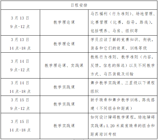 中國馬術(shù)協(xié)會關(guān)于舉辦三星級(中級教練員)培訓(xùn)班的通知 各相關(guān)單位、會員、馬術(shù)愛好者: 馬術(shù)運動的發(fā)展離不開優(yōu)秀的教練員、運動員做出的貢獻和投入。為了鼓勵馬術(shù)運動的傳承,中國馬術(shù)協(xié)會將針對優(yōu)秀的教練員、運動員申請教練員技術(shù)等級開辟特殊政策通道,對有對應(yīng)歷史比賽成績和教學(xué)經(jīng)驗的教練員、運動員進行定向培訓(xùn)定級。 為了提升馬術(shù)運動教學(xué)和訓(xùn)練水平,根據(jù)中國馬術(shù)協(xié)會教練員培訓(xùn)計劃,馬術(shù)中級教練培訓(xùn)將于2023年3月13日-15日在線下舉辦。本次培訓(xùn)將由經(jīng)驗豐富的外教來華授課,進一步提升執(zhí)教理論及實踐水平。培訓(xùn)合格者將被授予中國馬術(shù)協(xié)會三星級教練員能力水平證書。 現(xiàn)就本次培訓(xùn)相關(guān)事宜通知如下: 一、培訓(xùn)時間、地點 (一)時間:2023年3月13日-15日 (二)地點:待定 二、培訓(xùn)內(nèi)容 ※具體日程安排詳見后續(xù)日程安排表,根據(jù)報名人數(shù)可能會有調(diào)整。 三、報名資格要求 (一)年滿25周歲,身體健康; (二)具有中國馬術(shù)協(xié)會國三級騎手等級證書,執(zhí)教年限在5年以上; (三)帶訓(xùn)學(xué)員中至少有2名學(xué)員獲得中二級騎手等級或1名學(xué)員獲得中一級騎手等級;學(xué)員需要在該名教練帶訓(xùn)期間,獲得相應(yīng)騎手等級。 四、報名事項 (一)報名時間:自即日起至2023年2月20日12:00前報名并提交審核材料于報名專用郵箱,逾期報名無效。 (二)報名資料:報名表電子版,一寸白底照片2張及電子版,身份證復(fù)印件,有效成績及帶訓(xùn)學(xué)員騎手證復(fù)印件。 (三)報名方式:將報名表、一寸白底照片電子版等文件打包發(fā)送至報名郵箱?,F(xiàn)場報道時需提供2張一寸白底照片(背面寫姓名)、身份證復(fù)印件、有效成績及帶訓(xùn)學(xué)員騎手證證明復(fù)印件。 報名郵箱:liu.ying@ceatpo.com (四)報名確認:學(xué)員報名即需提交審核材料,確認后請于截止日期前繳納報名費,最終以報名確認信息或報名確認郵件為準。 (五)退課:課程準備工作按報名人數(shù)進行,因此報名一旦確認即產(chǎn)生費用。開課前15天及以上,可退款50%;開課前7天以上,不足15天,可退款25%;開課前7天內(nèi)(包含7天),不予退款。 (六)報名、咨詢聯(lián)系人:劉穎 聯(lián)系電話:18612650507 微信號:liu18612650507 郵箱:liu.ying@ceatpo.com (七)收費標(biāo)準:鼓勵為馬術(shù)運動競技水平提高做過貢獻的教練員,僅本次報名費用優(yōu)惠20%。 原價為11000元/人,優(yōu)惠后價格為8800元/人 (八)付款方式:銀行轉(zhuǎn)賬 匯款銀行:北京銀行天壇支行 匯款賬戶名:北京中聯(lián)金馬體育發(fā)展有限公司 賬號:20000045341600037064420 ※備注:1.【3星級教練員- 姓名 - 所繳費用】 2.匯款截圖或退款通知單請拍照截圖發(fā)送至報名郵箱:liu.ying@ceatpo.com 3.交通食宿費用自理 (九)如遇不可抗力因素(政府行為、戰(zhàn)爭、自然災(zāi)害、疫情問題等)造成學(xué)員的損失,中國馬術(shù)協(xié)會根據(jù)不同情況酌情處理。 附件:培訓(xùn)報名表 中國馬術(shù)協(xié)會 2023年2月3日 掃碼可獲取附件 |