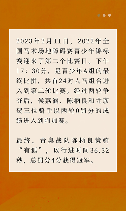 侯荔涵策騎馬匹“Lucky青”,以附加賽4罰分,行進(jìn)時(shí)間40.03秒的成績(jī)獲得亞軍,尤彥賀策騎馬匹“紀(jì)梵希”,以附加賽8罰分,行進(jìn)時(shí)間42.08秒的成績(jī)獲得季軍。 賽后,青奧戰(zhàn)隊(duì)陳柄良接受了《馬術(shù)》雜志的采訪。此次他一共帶了兩匹馬前來比賽,其中,合作一年半的馬匹“有狐”在此次比賽中與他配合突出,并最終取得了好成績(jī)。陳柄良在跟另一匹馬“大明大放”的配合過程中出了些失誤,但是他很快振作精神,再次與“有狐”搭檔登上了賽場(chǎng),在與“有狐”的配合過程中,他全程的表現(xiàn)很鎮(zhèn)定,在“有狐”的幫助下拿到了此次比賽的冠軍。 “‘有狐’是一匹很聰明的馬,他會(huì)思考他的騎手每個(gè)動(dòng)作的含義,努力去配合騎手的動(dòng)作習(xí)慣,可以說他是我的半個(gè)老師。我之前看過很多大騎手的采訪,他們一生中都會(huì)有幾匹讓他們受益匪淺的馬,對(duì)我來說,在這個(gè)階段,‘有狐’就是那匹馬?!?/div> 陳柄良今年21歲,在參加青少年錦標(biāo)賽的騎手中年齡較大,這也意味著,對(duì)他來講,能參加全國(guó)青少年錦標(biāo)賽的機(jī)會(huì)也越來越少了?!拔耶?dāng)時(shí)在想,這可能是我能參加的最后一場(chǎng)青少年錦標(biāo)賽了,我一定要全力以赴不留遺憾?!彪m然競(jìng)爭(zhēng)對(duì)手也都實(shí)力強(qiáng)勁,但陳柄良依舊頂住了壓力。“壓力大確實(shí)會(huì)緊張,會(huì)發(fā)揮失常。但當(dāng)壓力大到一個(gè)頂點(diǎn)之后,就無所謂了。而且我之前參加過幾屆青少年錦標(biāo)賽,都多多少少留有遺憾,這一次,我的最終目標(biāo)就是不留遺憾地完成整個(gè)比賽。” 目前,正在北京讀大學(xué)的陳柄良,把未來的側(cè)重點(diǎn)放在了馬術(shù)上。“我的短期目標(biāo)是希望自己在學(xué)業(yè)完成之前,成為一名能獨(dú)當(dāng)一面的馬術(shù)騎手,能不依賴教練和父母,而獨(dú)立訓(xùn)練、參賽。長(zhǎng)期目標(biāo)是將來從事馬術(shù)行業(yè),能夠活躍在賽場(chǎng)上,并且成為一名優(yōu)秀的馬術(shù)教練?!?/div> 陳柄良的教練王鵬皓分享了青奧戰(zhàn)隊(duì)的訓(xùn)練經(jīng)驗(yàn)。他表示:“我們的團(tuán)隊(duì)在去年12月就做了今年2月的比賽規(guī)劃,以賽代練讓騎手們?cè)缭绲剡M(jìn)入比賽的狀態(tài)。在1月份我們打了2022超級(jí)馬術(shù)俱樂部聯(lián)賽總決賽 & 2023天星調(diào)良馬術(shù)賀歲杯,過年的時(shí)間讓馬休息后,轉(zhuǎn)過年,青奧戰(zhàn)隊(duì)就來到了長(zhǎng)三角全明星鳥巢之路南北爭(zhēng)霸賽的賽場(chǎng),經(jīng)過一系列爭(zhēng)奪,我們獲得了全明星鳥巢之路南北爭(zhēng)霸賽的冠軍。就這樣,帶著一個(gè)良好的競(jìng)技狀態(tài),我們的團(tuán)隊(duì)來參加了全國(guó)場(chǎng)地障礙賽青少年錦標(biāo)賽?!?/div> |