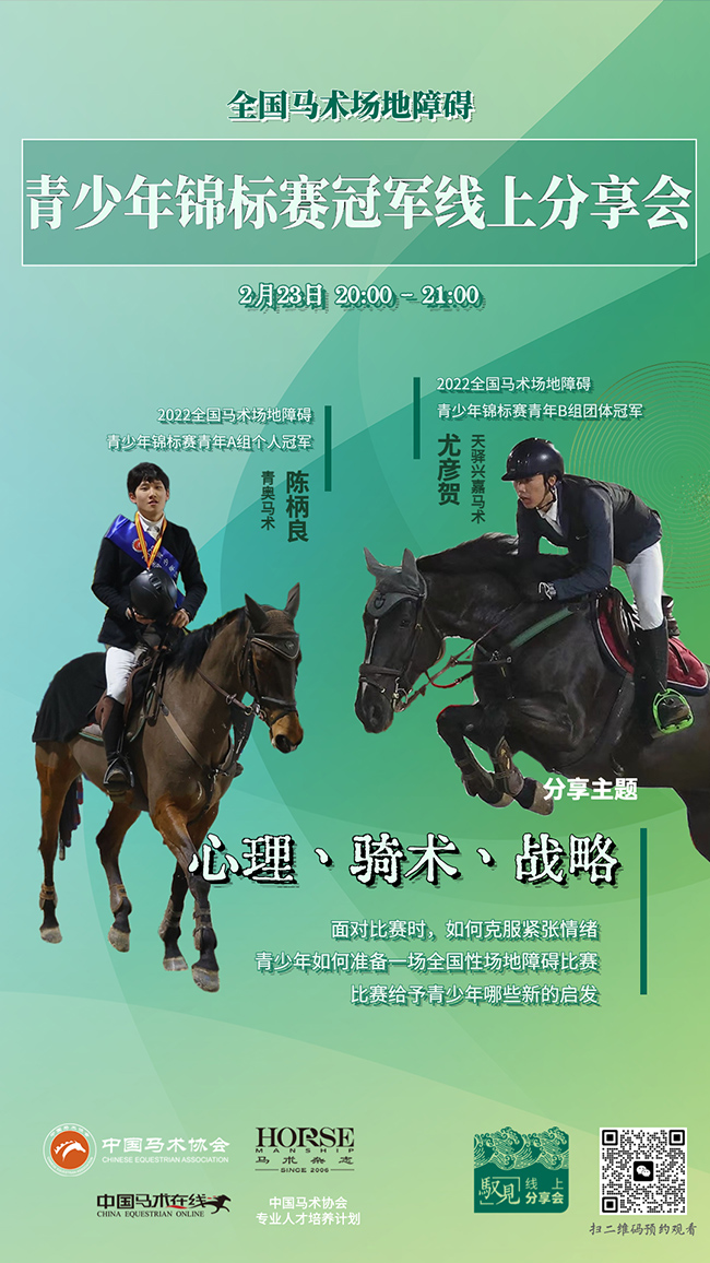 分享會主題 馭見·2022年全國馬術(shù)場地障礙青少年錦標賽冠軍 分享會嘉賓 青奧馬術(shù) 陳柄良、天驛興嘉馬術(shù) 尤彥賀 分享會時間 2月23日(周四)20:00-21:00 議題 面對比賽時,如何克服心理的緊張情緒? 青少年如何準備一場全國性場地障礙比賽? 比賽給予青少年哪些新的啟發(fā)? 在訓練過程中,教練、家長、馬各自的角色? 青少年馬術(shù)訓練中,日常的訓練安排? 陳柄良在2022年全國馬術(shù)場地障礙青少年錦標賽的勝利騎乘 背景 隨著馬術(shù)運動和馬術(shù)俱樂部的發(fā)展,馬術(shù)逐漸走入了人們的視野。在“馬術(shù)育人”理念的促進下,青少年在馬術(shù)運動項目中出現(xiàn)了幾何式增長。青少年馬術(shù)的不斷發(fā)展,讓每一位青少年有機會學習馬術(shù)運動的精神與文化內(nèi)涵,同時,為中國馬術(shù)運動的蓬勃發(fā)展打下了堅實基礎。 尤彥賀在2022年全國馬術(shù)場地障礙青少年錦標賽 馭見·2022年全國馬術(shù)場地障礙青少年錦標賽冠軍線上分享會旨在分享青少年參與馬術(shù)比賽的經(jīng)驗教訓,分享馬術(shù)訓練日常和訓練技巧,與青少年騎手和騎手家長共同探討那些騎手們的成長故事。 本次分享會由中國馬術(shù)協(xié)會官網(wǎng)主辦 中馬協(xié)媒信部、《馬術(shù)》雜志策劃執(zhí)行 將于2月23日(周四)20:00-21:00舉行 嘉賓 報名通道 掃碼添加“馬術(shù)在線”微信 回復關鍵詞“青少年”進群 |