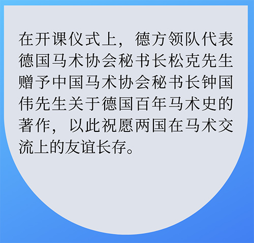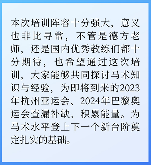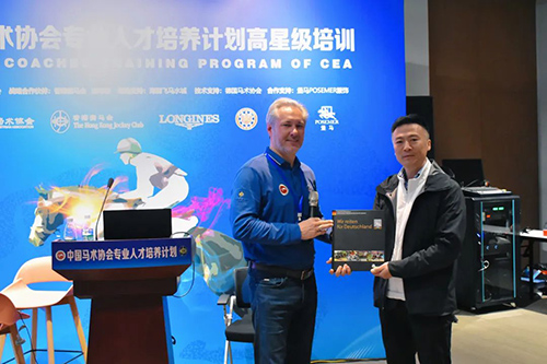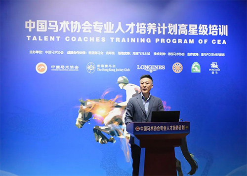 中國(guó)馬術(shù)協(xié)會(huì)秘書長(zhǎng)鐘國(guó)偉,中國(guó)馬術(shù)協(xié)會(huì)發(fā)展部部長(zhǎng)侯天博,江蘇省馬術(shù)協(xié)會(huì)會(huì)長(zhǎng)沈厚鋒,江蘇省馬術(shù)協(xié)會(huì)秘書長(zhǎng)劉煜,德國(guó)馬術(shù)協(xié)會(huì)認(rèn)證教官漢諾·弗雷登(Hanno Vreden)先生,德國(guó)騎手協(xié)會(huì)盛裝舞步項(xiàng)目主席、盛裝舞步國(guó)家級(jí)裁判沃爾夫?qū)ぐ8褙悹査梗╓olfgang Egbers)先生,奧運(yùn)冠軍騎手桑德拉·奧法特(Sandra Auffahrt)女士,以及德國(guó)新生代冠軍騎手珍妮特·埃格貝爾斯(Janet Egbers)女士出席了高星級(jí)教練培訓(xùn)的開課儀式。 中國(guó)馬術(shù)協(xié)會(huì)秘書長(zhǎng)鐘國(guó)偉 本次培訓(xùn)是2021年中國(guó)馬術(shù)協(xié)會(huì)公布星級(jí)教練員培訓(xùn)體系以來(lái)的第一次高星級(jí)教練培訓(xùn)。前來(lái)參加培訓(xùn)的均是國(guó)內(nèi)優(yōu)秀的教練員們。此次,共有50多位教練員將參與到為期4天的高星級(jí)教練培訓(xùn)的課程中來(lái)。 漢諾·弗雷登(Hanno Vreden)先生(左)沃爾夫?qū)ぐ8褙悹査梗╓olfgang Egbers)先生(右) 中國(guó)馬術(shù)協(xié)會(huì)秘書長(zhǎng)鐘國(guó)偉首先致詞,他表示:“當(dāng)前中國(guó)馬術(shù)項(xiàng)目的競(jìng)技與普及程度都在同步發(fā)展。在奧運(yùn)舞臺(tái)上,我們創(chuàng)造了歷史成績(jī)。疫情結(jié)束后,馬術(shù)賽事呈現(xiàn)出百花齊發(fā)的態(tài)勢(shì),中馬協(xié)會(huì)也進(jìn)一步加快專業(yè)人才培養(yǎng)的步伐,夯實(shí)基礎(chǔ)。馬術(shù)教練是馬術(shù)行業(yè)內(nèi)非常專業(yè)的群體,不斷培育著人才。希望教練們可以不斷提升,為馬術(shù)行業(yè)貢獻(xiàn)自己的力量。” 桑德拉·奧法特(Sandra Auffahrt)接受央視記者采訪 奧運(yùn)冠軍騎手桑德拉·奧法特(Sandra Auffahrt)女士接受了采訪,并給出了她對(duì)中國(guó)教練員的建議,她表示:“我們應(yīng)該重點(diǎn)關(guān)注的是人和馬的關(guān)系,要去了解馬的情緒,照顧馬的接受程度,根據(jù)馬的情況去修改你的訓(xùn)練計(jì)劃,最終實(shí)現(xiàn)與馬共同進(jìn)步,而不單是關(guān)注訓(xùn)練的成果,或者比賽的結(jié)果。當(dāng)你在一場(chǎng)比賽中感覺吃力,不要再去挑戰(zhàn)更高的難度,而是要不斷與馬訓(xùn)練,沉淀自己,等到攢足能量后,再去成就自己的下一個(gè)階段。而這個(gè)過(guò)程中的重點(diǎn)是實(shí)現(xiàn)人與馬和諧一致地前進(jìn)?!?/div> 文/門景鈺 圖/中馬協(xié)人才培養(yǎng)計(jì)劃 |