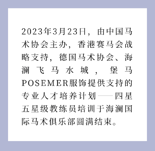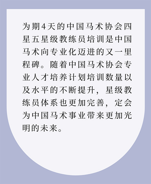 在3月20日-23日共為期4天的四星五星教練員培訓(xùn)中,教練員們進(jìn)行了教練行為準(zhǔn)則、場(chǎng)地障礙路線設(shè)計(jì)、三項(xiàng)賽訓(xùn)練計(jì)劃、奧運(yùn)訓(xùn)練經(jīng)驗(yàn)、運(yùn)動(dòng)科學(xué)、實(shí)踐訓(xùn)練、舞步理論教學(xué)、舞步訓(xùn)練等課程的學(xué)習(xí),課程涉及奧運(yùn)馬術(shù)三個(gè)項(xiàng)目的諸多方面。中國(guó)馬術(shù)星級(jí)教練體系作為行業(yè)指導(dǎo),其中很多內(nèi)容與教練員指導(dǎo)學(xué)員參賽及考級(jí)規(guī)劃相關(guān),為教練員們制定科學(xué)的教學(xué)體系和方法。教練員們可以根據(jù)學(xué)習(xí)到的體系知識(shí)制定教學(xué)計(jì)劃、備戰(zhàn)計(jì)劃、科學(xué)訓(xùn)練等,拓寬了教練員知識(shí)領(lǐng)域的廣度和寬度。 同時(shí),德國(guó)團(tuán)隊(duì)(領(lǐng)隊(duì)Sacha Eckjans先生,德國(guó)馬術(shù)協(xié)會(huì)認(rèn)證教官Hanno Vreden先生,德國(guó)騎手協(xié)會(huì)盛裝舞步項(xiàng)目主席、盛裝舞步國(guó)家級(jí)裁判Wolfgang Egbers先生,奧運(yùn)冠軍騎手Sandra Auffahrt女士以及德國(guó)新生代冠軍騎手Janet Egbers女士)的授課,從馬匹的角度切入,引導(dǎo)教練員們要重視馬匹反饋對(duì)于提升默契度的幫助,從而更好地實(shí)現(xiàn)人馬合一的效果。幫助教練員們提升理念的同時(shí),開啟了國(guó)際化視野。 本次培訓(xùn)是2021年中國(guó)馬術(shù)協(xié)會(huì)公布星級(jí)教練員培訓(xùn)體系以來的第一次四星五星級(jí)教員練培訓(xùn),共有50多位來自全國(guó)各地的優(yōu)秀教練員參與其中。培訓(xùn)結(jié)束后,多位教練員表達(dá)了對(duì)此次培訓(xùn)的感悟。他們表示:“國(guó)外導(dǎo)師教給大家如何以理論指導(dǎo)實(shí)踐、再用實(shí)踐驗(yàn)證理論,全方位講解了場(chǎng)地障礙和盛裝舞步訓(xùn)練的精髓。數(shù)天時(shí)間我們學(xué)習(xí)到了高水平馬術(shù)教育科學(xué)合理的知識(shí)和實(shí)踐,也為我國(guó)馬術(shù)基礎(chǔ)教育的發(fā)展指引了方向。我們希望能在今后的訓(xùn)練和教學(xué)中,以此為綱進(jìn)一步豐富框架中的相關(guān)內(nèi)容,在中國(guó)馬術(shù)協(xié)會(huì)的帶領(lǐng)下,攜手同心使我國(guó)馬術(shù)教育更系統(tǒng)、更科學(xué),為中國(guó)馬術(shù)事業(yè)的更好發(fā)展而奮斗” 場(chǎng)地障礙騎手哈達(dá)鐵 場(chǎng)地障礙騎手哈達(dá)鐵,有著40余年的騎馬經(jīng)歷,曾在1985年獲日本大阪亞洲國(guó)際超越障礙賽冠軍,并曾多次獲全運(yùn)會(huì)團(tuán)體冠軍,全國(guó)錦標(biāo)賽個(gè)人、團(tuán)體冠軍。如今已60歲的他,對(duì)馬術(shù)事業(yè)的熱愛自始至終。他表示:“過去對(duì)馬術(shù)的認(rèn)知不夠,現(xiàn)在不一樣了,現(xiàn)在馬術(shù)就是生活。我享受帶領(lǐng)年輕的學(xué)員參加比賽的感覺。如果有機(jī)會(huì)的話,我也會(huì)上場(chǎng)。作為職業(yè)的教練,我認(rèn)為中國(guó)目前需要高層次的教學(xué),需要對(duì)教練分級(jí)、分層次,開設(shè)更有針對(duì)性的課程?!?/div> 場(chǎng)地障礙騎手李振強(qiáng) 此次參與教員練培訓(xùn)的還有廣東東莞金伯樂學(xué)府創(chuàng)始人、兩屆奧運(yùn)會(huì)場(chǎng)地障礙騎手李振強(qiáng),他表示:“德國(guó)的馬術(shù)體系是世界上最好的馬術(shù)體系之一,他們的體系是經(jīng)過上百年的經(jīng)驗(yàn)總結(jié)出來的。邀請(qǐng)德國(guó)團(tuán)隊(duì)進(jìn)行培訓(xùn),能夠幫助中國(guó)的馬術(shù)更系統(tǒng)、更有針對(duì)性地向前發(fā)展。以高星級(jí)教練員培訓(xùn)的場(chǎng)地障礙路線設(shè)計(jì)課程為例,場(chǎng)地障礙學(xué)習(xí)的成果,是在賽場(chǎng)上跳全程來展現(xiàn)的。所有的馬術(shù)學(xué)校,都希望能完成場(chǎng)地障礙的路線教學(xué)。并且?guī)W(xué)員打比賽,實(shí)現(xiàn)以賽代練,都涉及到場(chǎng)地障礙設(shè)計(jì)的相關(guān)知識(shí)。一個(gè)好的教練員不僅要懂得怎么馴馬、怎么擺障礙,還需要懂馬術(shù)賽事的規(guī)則,以及一些簡(jiǎn)單的獸醫(yī)知識(shí)等,其包含的知識(shí)很廣泛?!?/div> 場(chǎng)地障礙騎手張可 張可,天星調(diào)良馬術(shù)總教練,自1988年跨上馬背,在馬術(shù)行業(yè)征戰(zhàn)了30多年,六屆全運(yùn)會(huì)元老,是至今依舊在一線的老將。張教練表示:“此次中國(guó)馬術(shù)協(xié)會(huì)的高星級(jí)教練員培訓(xùn),天星調(diào)良馬術(shù)派出了3名教練。高水平的教練齊聚一堂,所有人都表現(xiàn)出了對(duì)此次培訓(xùn)的高度重視。我個(gè)人覺得這次培訓(xùn)的收獲不小。首先這幾天的課程對(duì)我自身來講是一個(gè)復(fù)習(xí)的過程,也是對(duì)我之前積累的部分經(jīng)驗(yàn)的肯定,同時(shí)我也收獲到了一些新的東西,只是這些技術(shù)技巧還需要在以后工作中去實(shí)踐,才能真正融會(huì)貫通,為己所用?!?/div> 盛裝舞步騎手顧兵 1995年從事馬術(shù)運(yùn)動(dòng),參加過22屆全國(guó)錦標(biāo)賽、6屆全運(yùn)會(huì),多次獲盛裝舞步錦標(biāo)賽、全運(yùn)會(huì)團(tuán)體、個(gè)人冠軍的顧兵也來到此次培訓(xùn)的現(xiàn)場(chǎng)。此次培訓(xùn)前兩天的授課以場(chǎng)地障礙項(xiàng)目
