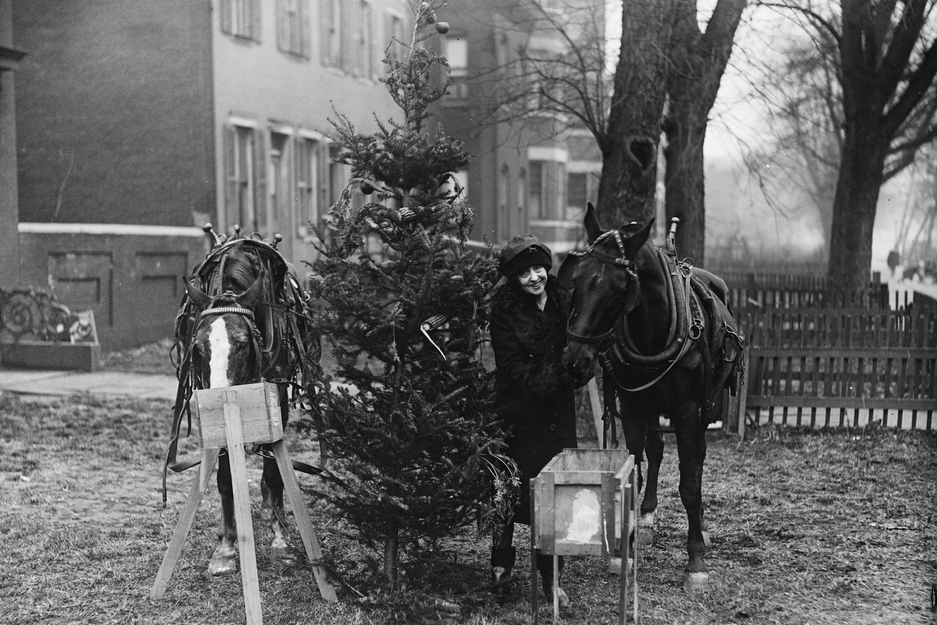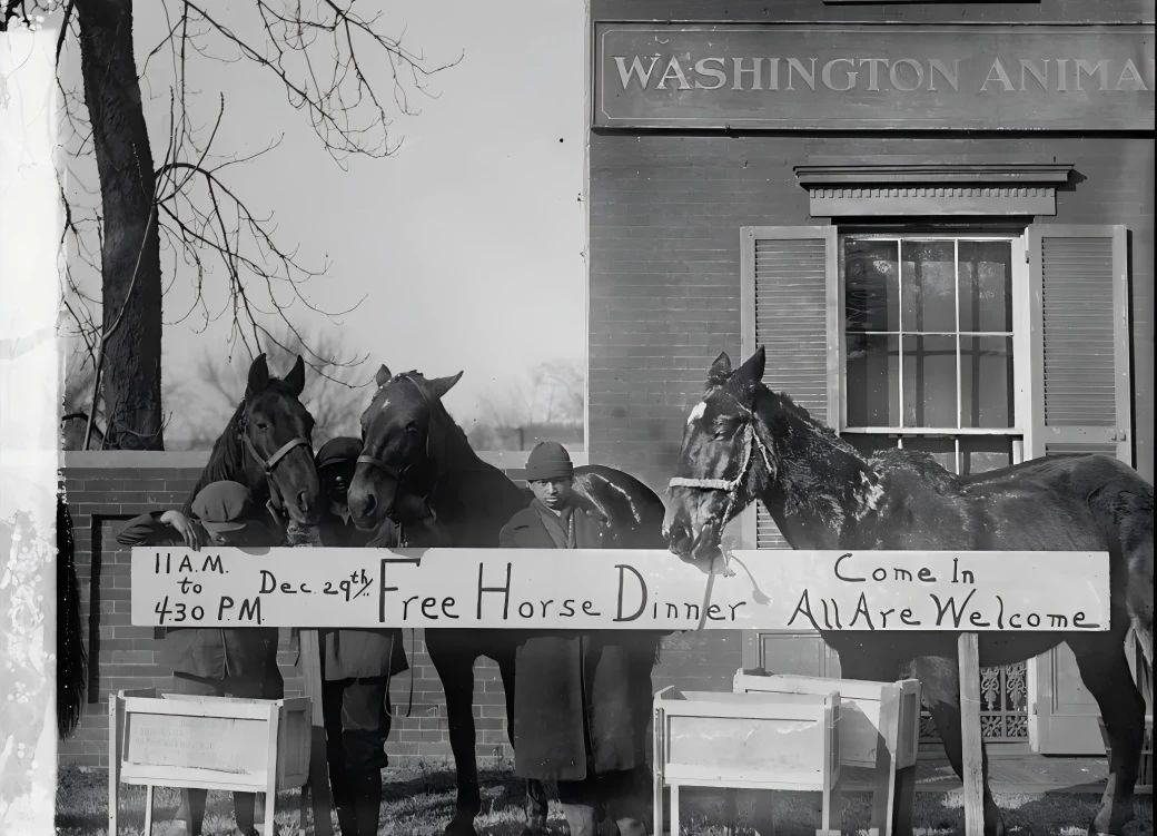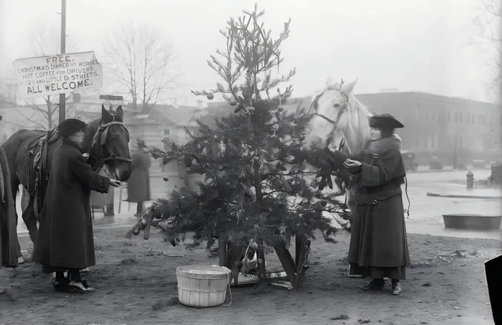 1918 年圣誕節(jié)前夕,華盛頓動(dòng)物救援聯(lián)盟(WARL)的志愿者們用干草、玉米、胡蘿卜和蘋(píng)果裝飾了一棵樹(shù),準(zhǔn)備舉行派對(duì)。圣誕節(jié)當(dāng)天無(wú)法舉行晚宴,因?yàn)橥ǔG闆r下,節(jié)日期間馬會(huì)被關(guān)在馬廄休息。